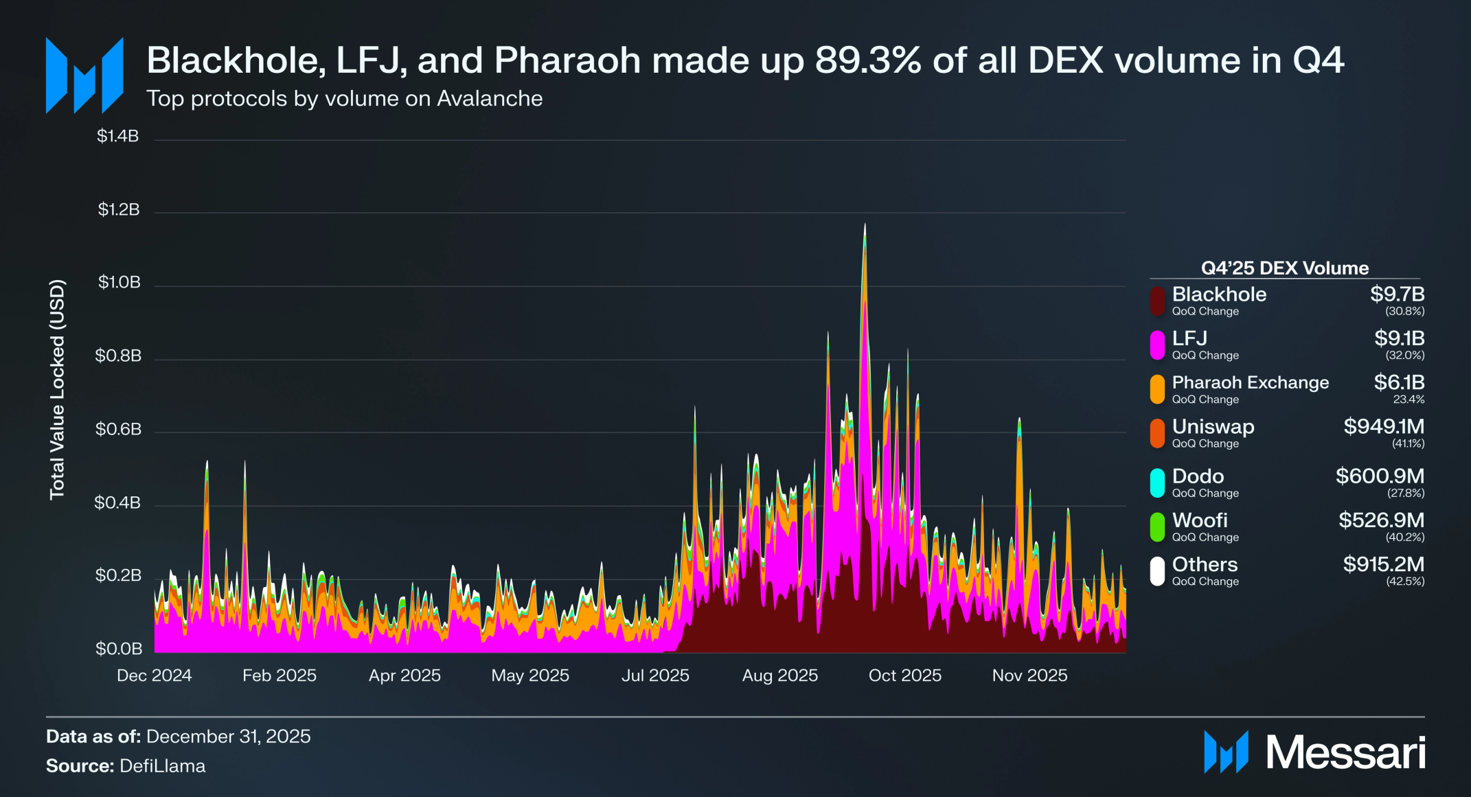 블랙홀은 Q3 피크에서 37.6% 감소했음에도 불구하고 Q4에 1억 500만 달러로 총 거래량의 34.7%를 차지하며 거래량 기준 선도 DEX로 남았다. LFJ는 그 뒤를 바짝 따라 9,850만 달러의 평균 일일 거래량과 32.6% 시장 점유율을 기록하며 2024년 후반 수준에서 크게 증가했다. 파라오 익스체인지는 분기의 주목할 만한 성과자로 거래량이 QoQ 23.3% 증가하여 6,660만 달러가 되었으며 아발란체 DEX 전체 거래량의 22.0%를 차지했다.