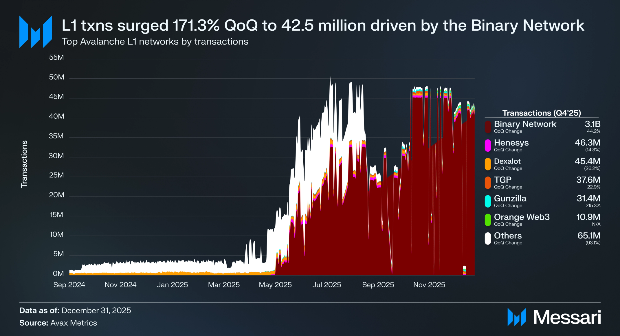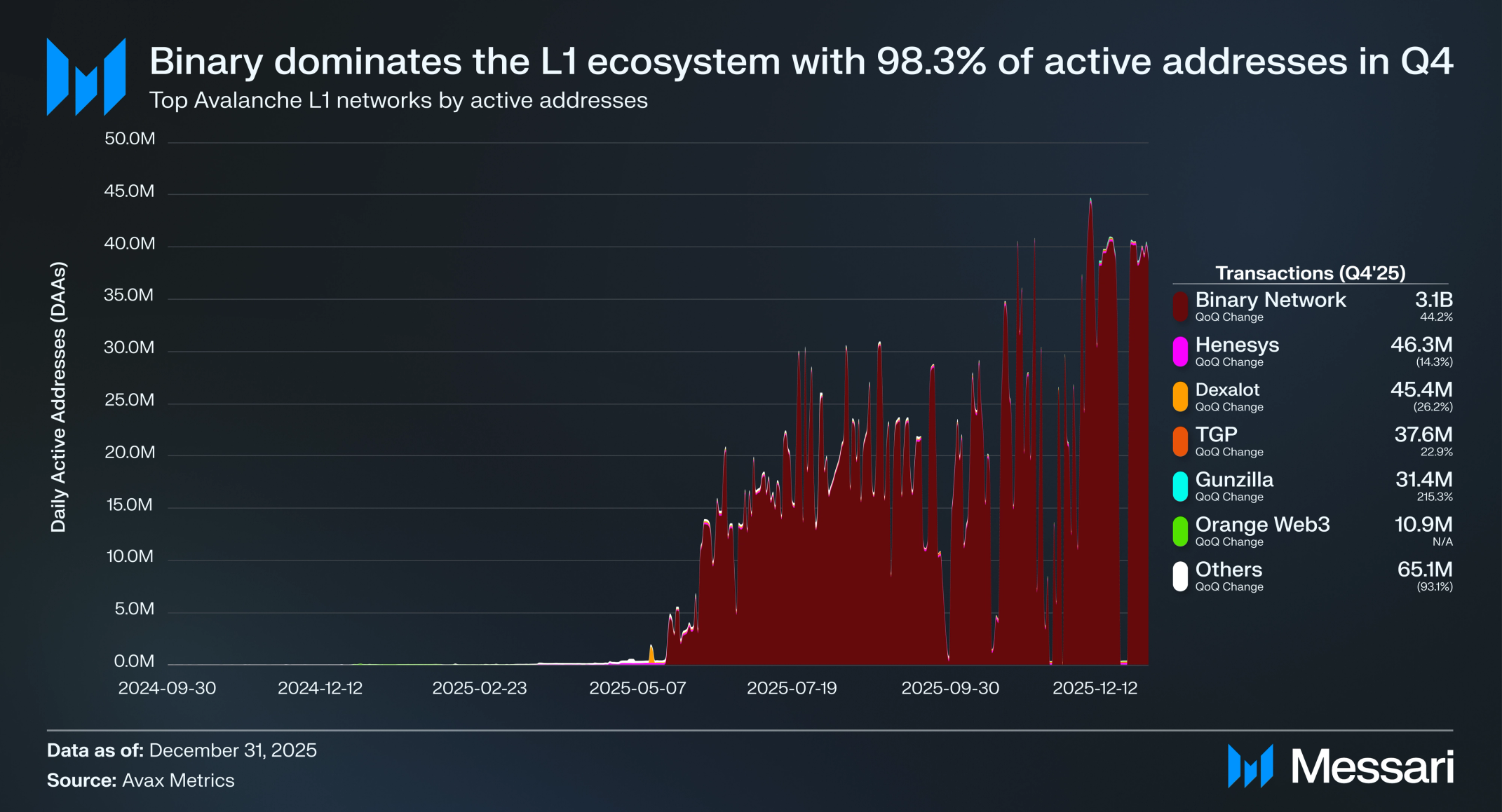 아발란체 L1의 거래는 2025년 Q4에 크게 증가했다. Q4 2025 마지막 날 일일 L1 거래는 4,250만 건에 도달하여 2024년 Q4에 기록된 296만 건에서 YoY 1,334% 증가했다. 바이너리 네트워크(Binary Network)는 생태계를 계속 지배하며 시장 점유율을 Q3의 65.9%에서 Q4의 모든 L1 거래의 92.9%로 27 퍼센트포인트 증가시켰다. 바이너리는 Q4에 총 31억 1천만 건의 거래를 처리하여 Q3의 21억 4천만 건에서 QoQ 45.7% 증가했다.
