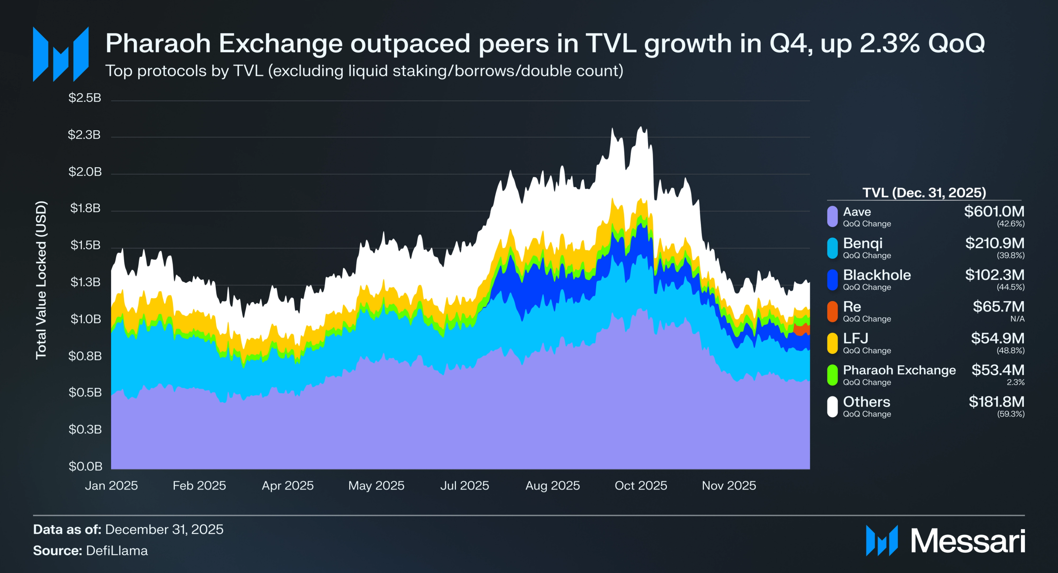 파라오 익스체인지(Pharaoh Exchange)는 Q4의 주목할 만한 성과자로, QoQ와 YoY 지표 모두에서 긍정적 성장을 보인 유일한 주요 DeFi 프로토콜이었으며 각각 2.3%와 66.9% 상승했다. 파라오는 2025년 11월 21일 일일 수수료에서 사상 최고치를 기록하며 284,210 달러의 수익을 창출했다. 2025년 Q4 아발란체 C-Chain의 TVL 기준 상위 3개 프로토콜이 총 C-Chain TVL의 72.0%를 차지했다: