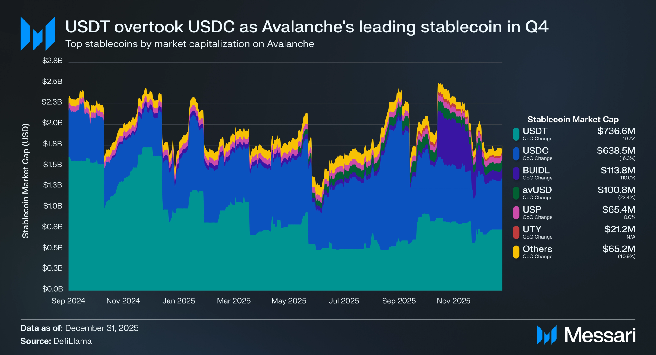 • 블랙록(BlackRock)은 온체인 머니마켓 펀드인 BUIDL을 통해 아발란체에 5억 달러를 토큰화했다. 이 배치로 RWA TVL이 QoQ 68.6%, YoY 949.3% 증가하여 연말 기준 13억 3천만 달러에 도달했다.