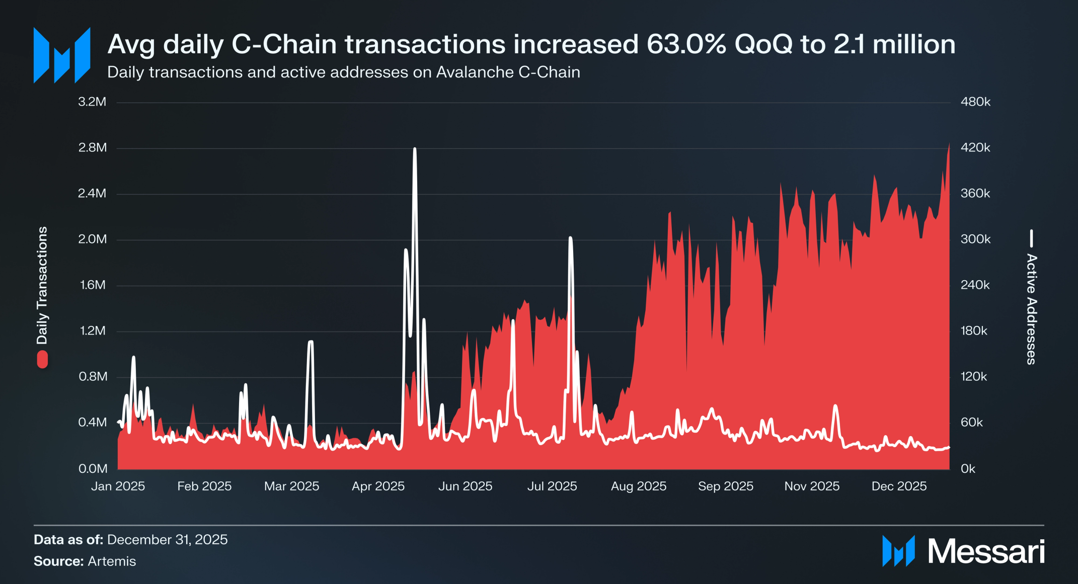 아발란체 C-Chain 사용 지표는 연중 마지막 분기 내내 상승 추세를 보였다. 일평균 거래는 QoQ 63.0%, YoY 799.3% 증가하여 210만 건에 달했다. 사용자 참여도 유사한 궤적을 따라 일평균 활성 주소가 QoQ 14.2%, YoY 180.4% 증가하여 319,010개가 되었다. 네트워크 활동은 연말을 향해 급증하여 2025년 12월 31일 일일 활성 주소가 436,783개에 달했다.