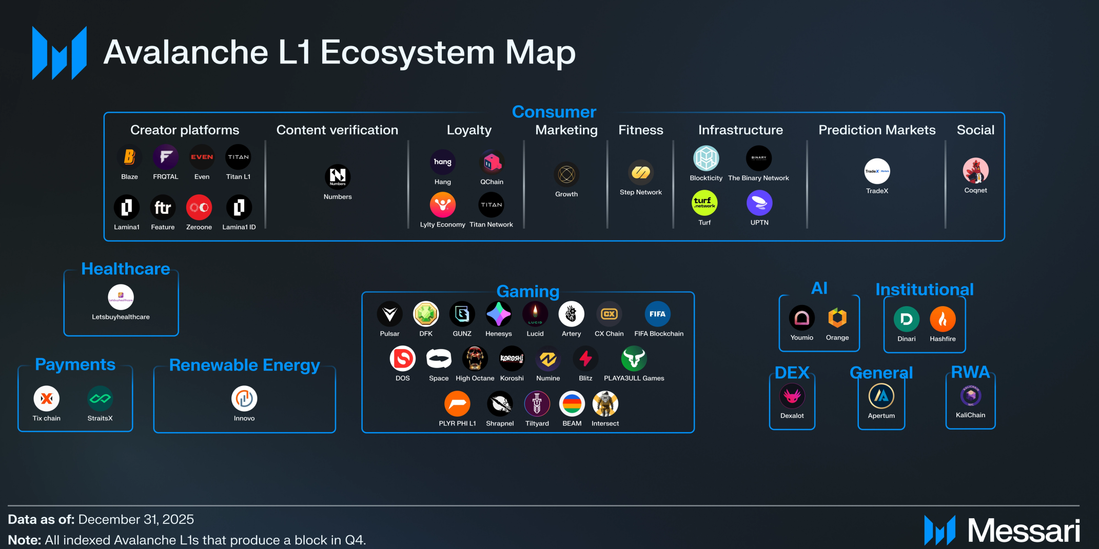 Q4에 아발란체는 L1 생태계의 꾸준한 확장을 보았으며, 활성 L1 수가 QoQ 10.3% 증가하여 68개에서 75개가 되었다. 주목할 만한 출시로는 스트리밍 플랫폼인 블레이즈(Blaze)와 인디 게임 허브인 그로토(Grotto) 같은 소비자 및 게임 L1이 있었다.
