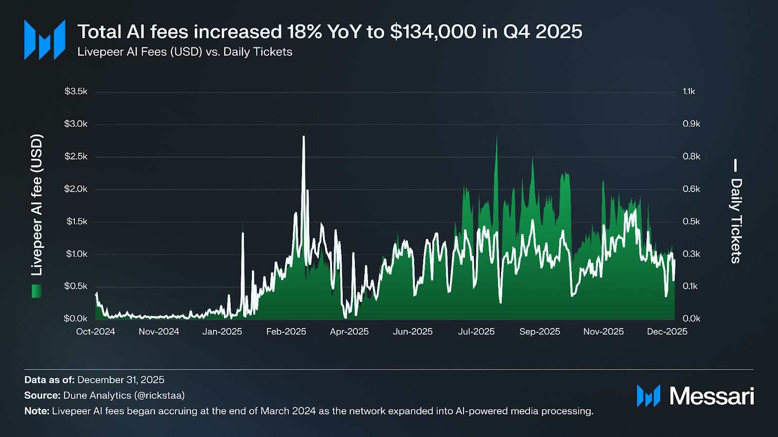 • AI 주도 수수료는 4분기에 약 13만 4,000달러를 기록했으며(전분기 대비 -9%), 전체 프로토콜 수익의 70% 이상을 계속 차지했다. 이는 AI 추론이 네트워크 수익화의 주요 동인임을 확인시켜준다.