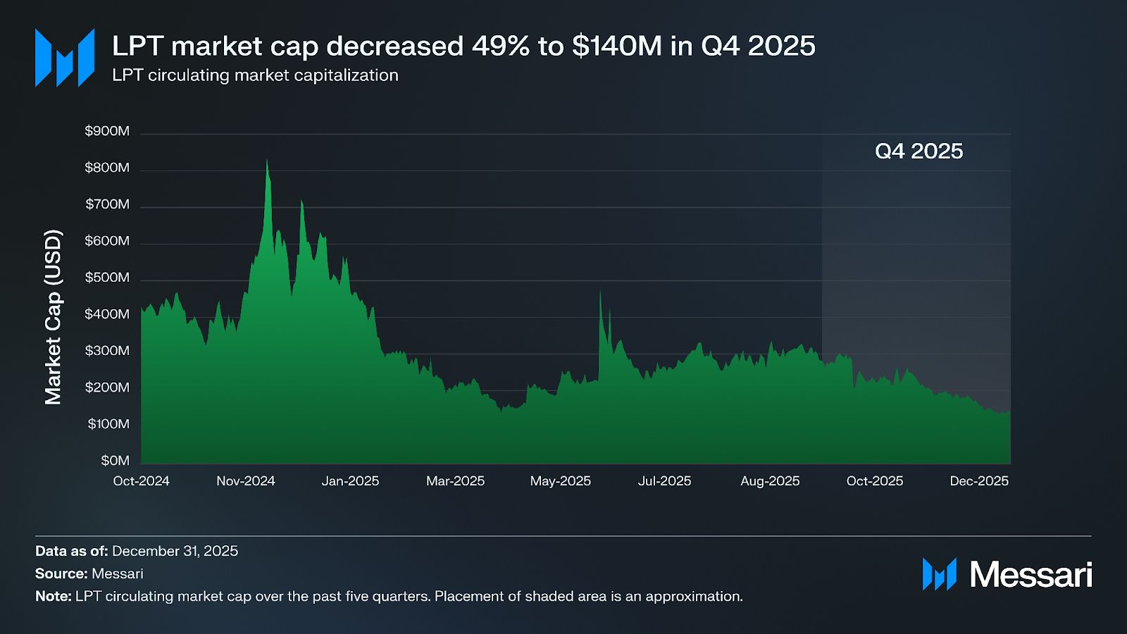 LPT의 유통 시가총액은 전분기 대비 48.6% 감소하여 2025년 4분기 1억 3,970만 달러를 기록했으며(3분기 2억 7,180만 달러에서), 이는 주로 토큰 가격이 전분기 대비 52.1% 하락하여 2.90달러(6.00달러에서)가 된 데 따른 것이다. 유통 공급량은 약 4,530만 개에서 4,820만 LPT로 소폭 증가했으며(약 290만 개 증가, 전분기 대비 약 6.4%), 이는 지속적인 발행과 일치한다. 그러나 이러한 공급 확대는 가격 하락의 규모를 상쇄하기에 불충분했으며, 결과적으로 분기 유통 시가총액의 순 축소를 초래했다. 전년 동기 대비로는 유통 시가총액이 전년 동기 대비 74.8% 하락했으며(2024년 4분기 5억 5,370만 달러에서) LPT 가격의 전년 동기 대비 80.7% 하락(15.0달러에서)과 함께 발생했다.