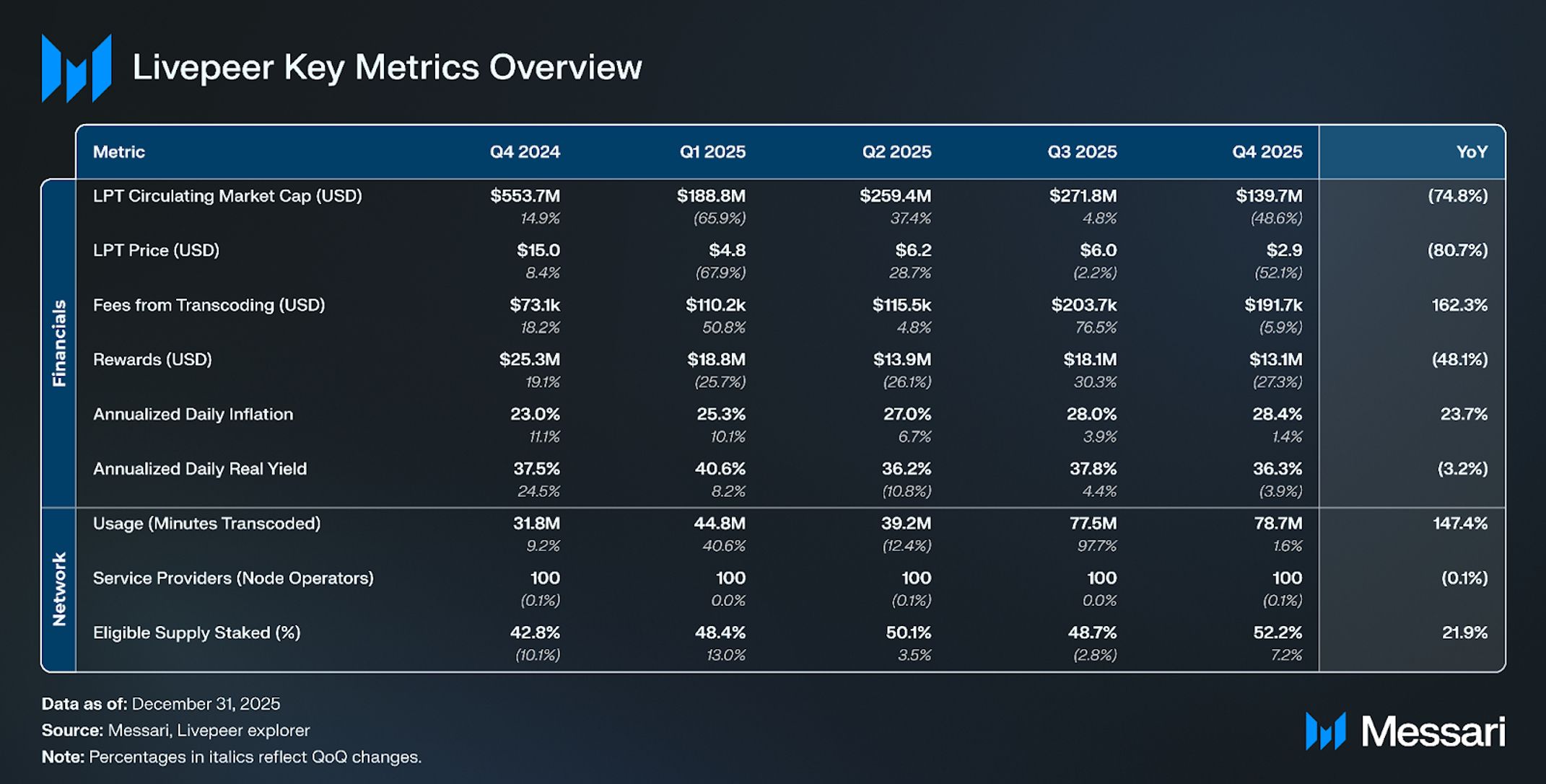 라이브피어 토큰(LPT)은 스테이크 포 액세스(Stake-for-Access, SFA) 모델로 운영되며, 노드 운영자가 네트워크에서 작업을 수행하려면 LPT를 스테이킹해야 한다. 지난 7개 분기 동안 스테이킹 참여율, 즉 스테이킹된 유통 LPT 공급량의 비율은 50% 목표 수준 이하로 유지되었다. 또한 위임자 수는 감소하여 2025년 3분기 2,683명에서 4분기 2,570명으로 줄어들었으며, 이는 네트워크 보안에 도움을 주는 활성 참여자 수의 감소를 반영한다.