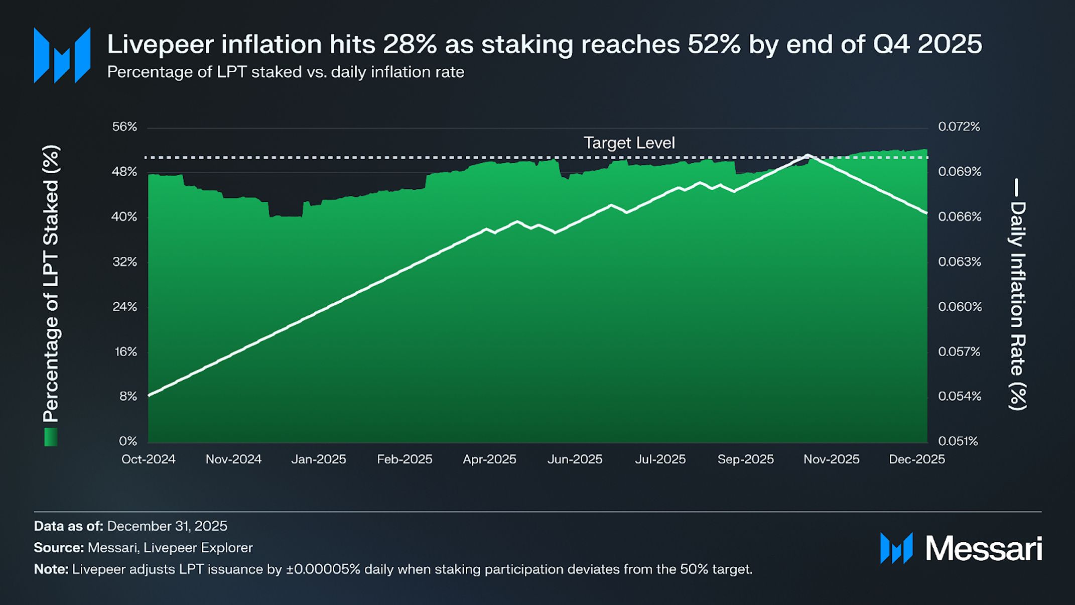 전반적으로 4분기는 비교적 안정적인 네트워크 처리량과 함께 높은 스테이킹 참여율과 완화되는 인플레이션 역학을 반영했다. 이는 네트워크 보안 가정을 지원하지만 라이브피어 스테이킹 경제의 구조적 특성을 계속 강조한다. 스테이크 가중치가 작업 부하 실행을 완벽하게 추적하지 못하며, 이는 오케스트레이터 간 자본 배분과 수수료 생성 간의 차이로 이어질 수 있다.