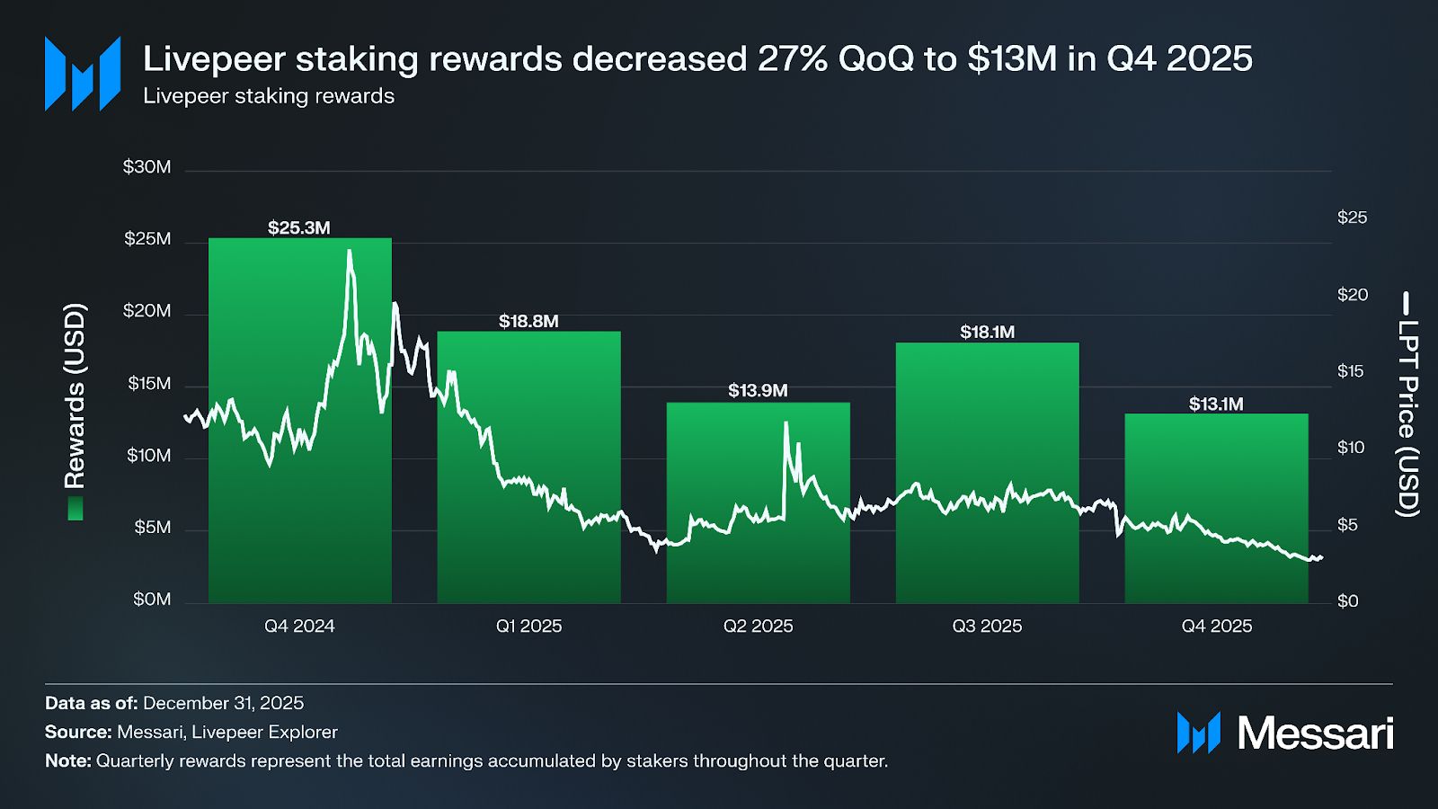 3분기와 대조적으로, 유통 공급량 확대, 스테이킹 참여율 감소, 강력한 수수료 성장이 결합하여 달러 표시 보상을 상승시켰던 것과 달리, 4분기는 가격 주도 위축을 반영했다. 전반적으로 이 분기는 스테이킹 참여율과 네트워크 사용량이 비교적 회복력을 유지했음에도 불구하고 LPT 가격 변동에 대한 달러 보상의 지속적인 민감성을 부각시킨다.