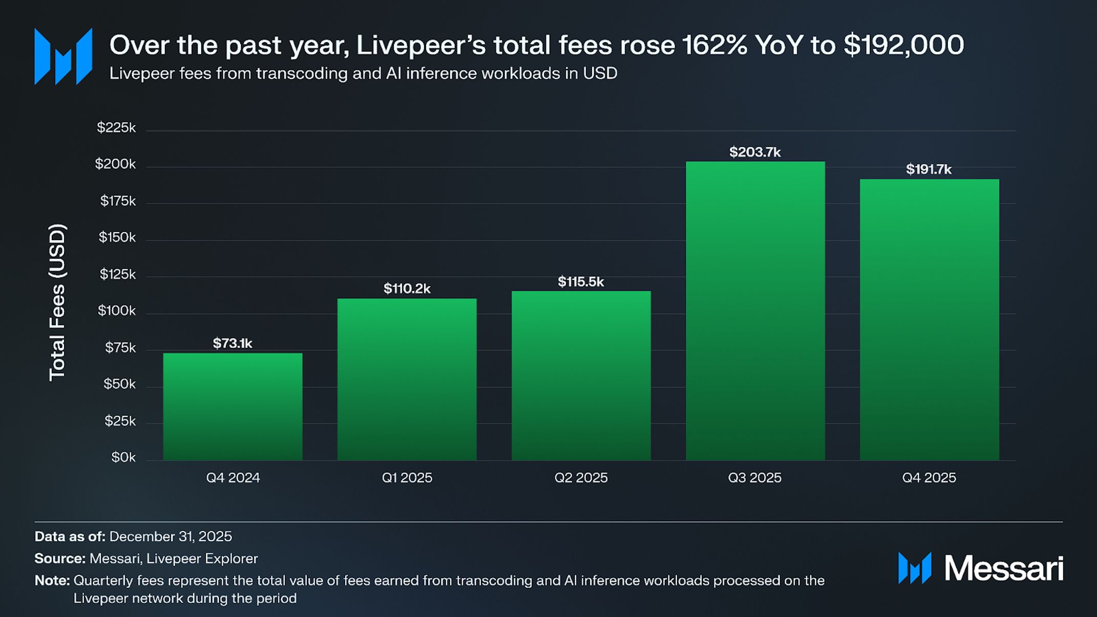 라이브피어의 수요측 총 수수료는 전년 동기 대비 162% 증가하여 2024년 4분기 7만 3,100달러에서 2025년 4분기 19만 1,700달러로 상승했으며, 이는 연말까지 높아진 네트워크 수익화 수준을 반영한다.