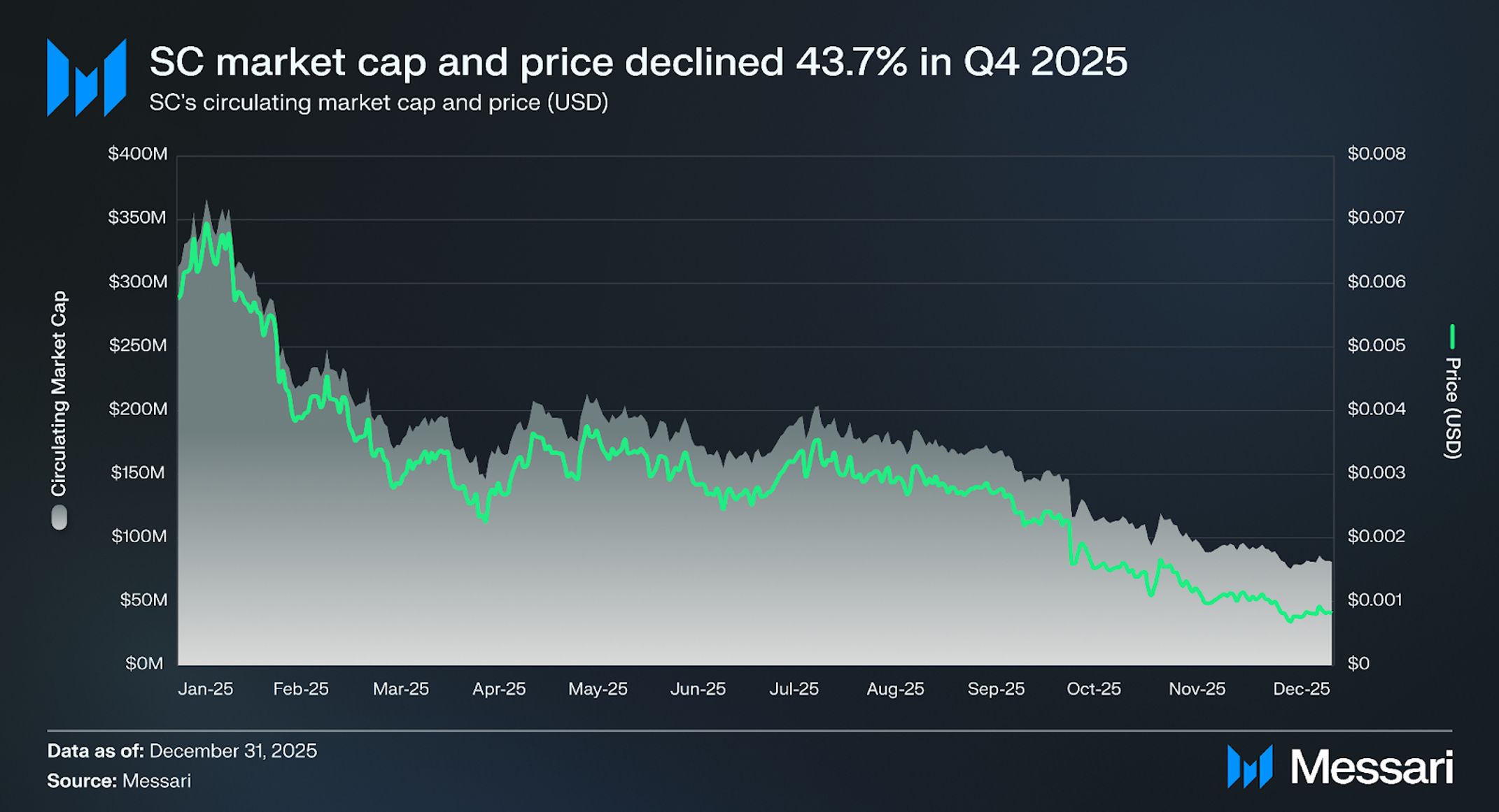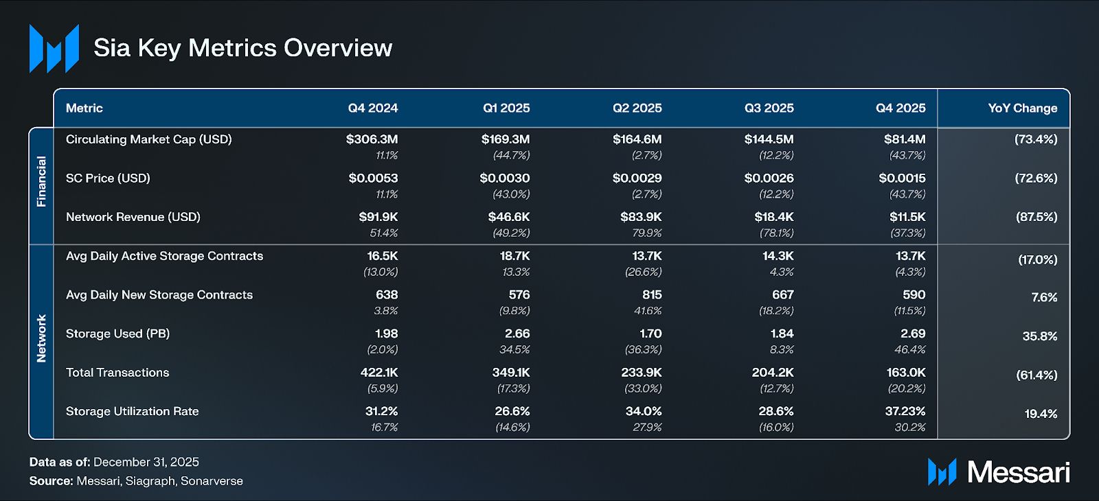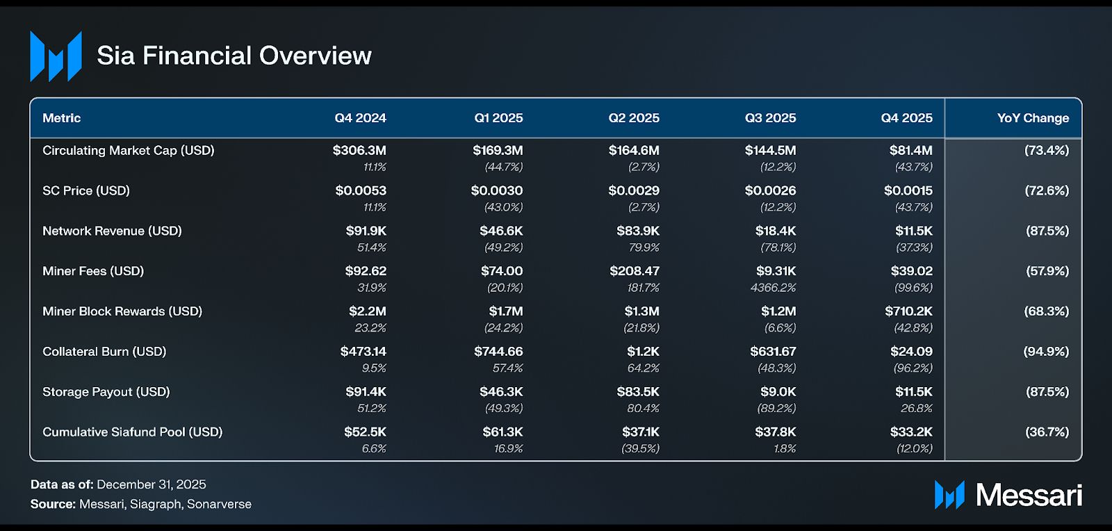 • SC 토큰 가격은 전분기 대비 43.7% 하락하여 0.0015달러를 기록했다. 이는 2025년 11월 18일 이전 6주 동안 총 암호화폐 시장 가치에서 추정 1조 2,000억 달러가 소실된 시기에 발생했다.