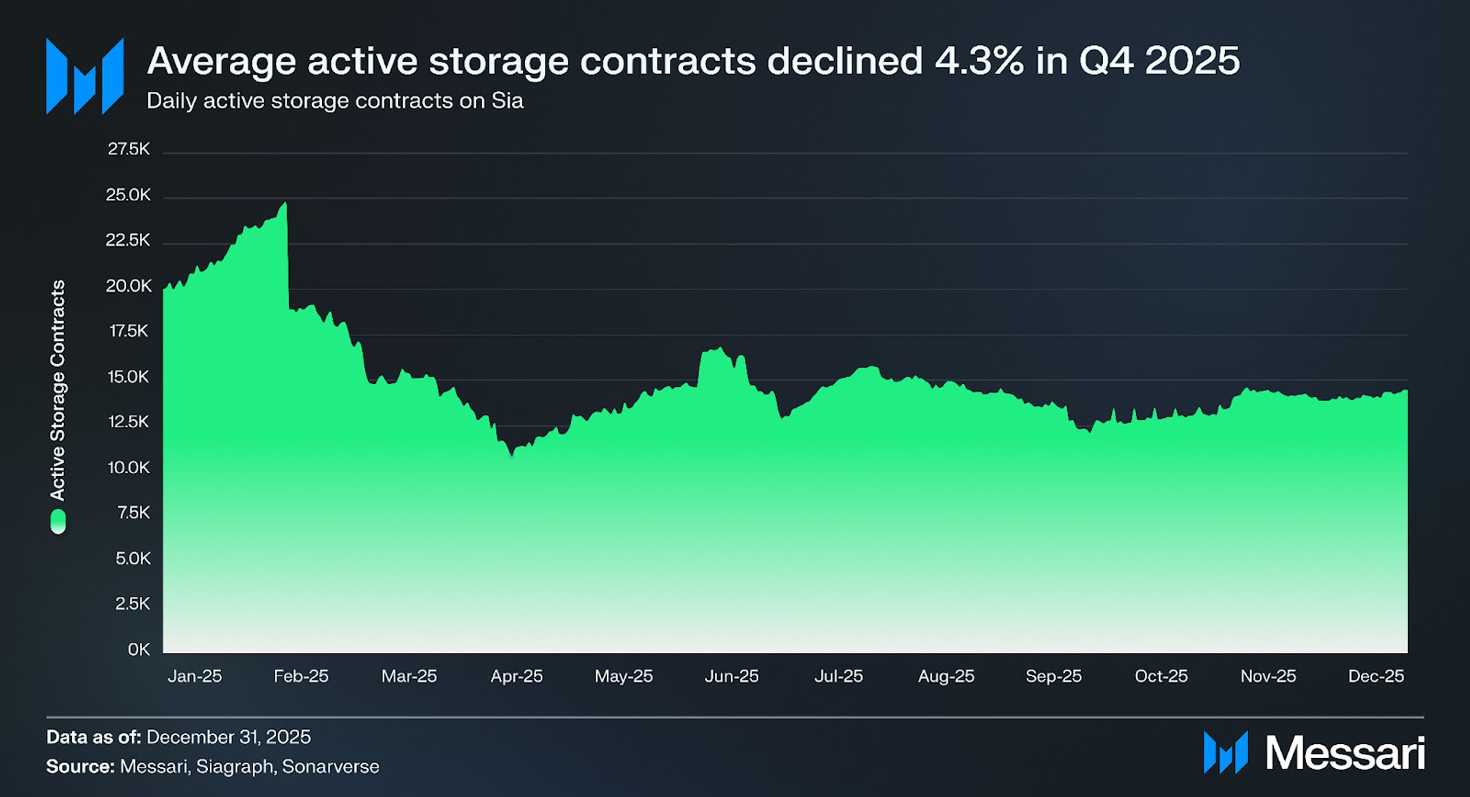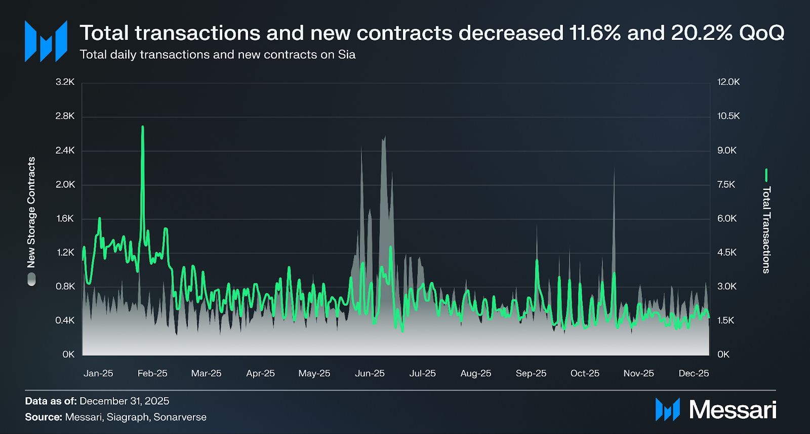 시아의 네트워크 활동은 2025년 4분기에 감소했으며, 연초부터 시작된 둔화를 연장했다. 일일 트랜잭션은 분기 동안 평균 1,770건을 기록했으며, 이는 2025년 3분기 2,220건에서 전분기 대비 20.2% 감소한 수치다. 신규 스토리지 계약 생성도 감소하여 일일 평균 590건의 계약을 기록했으며, 이는 667건에서 전분기 대비 11.6% 하락한 것이다.