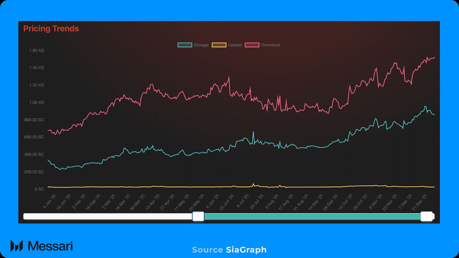 2025년 4분기에 시아의 평균 스토리지 비용은 TB당 월 738.3 SC로 증가했으며, 이는 3분기 555.8 SC에서 전분기 대비 32.8% 증가한 것이다. 달러로 표시하면 평균 비용은 이전 분기 1.43달러에서 1.37달러로 하락했다. 연초부터 시작된 이러한 지속적인 괴리는 호스트가 시아코인의 달러 가치 하락을 상쇄하기 위해 SC 표시 가격을 인상했지만, 그 인상이 달러 표시 가격을 보존하지 못했음을 나타낸다.