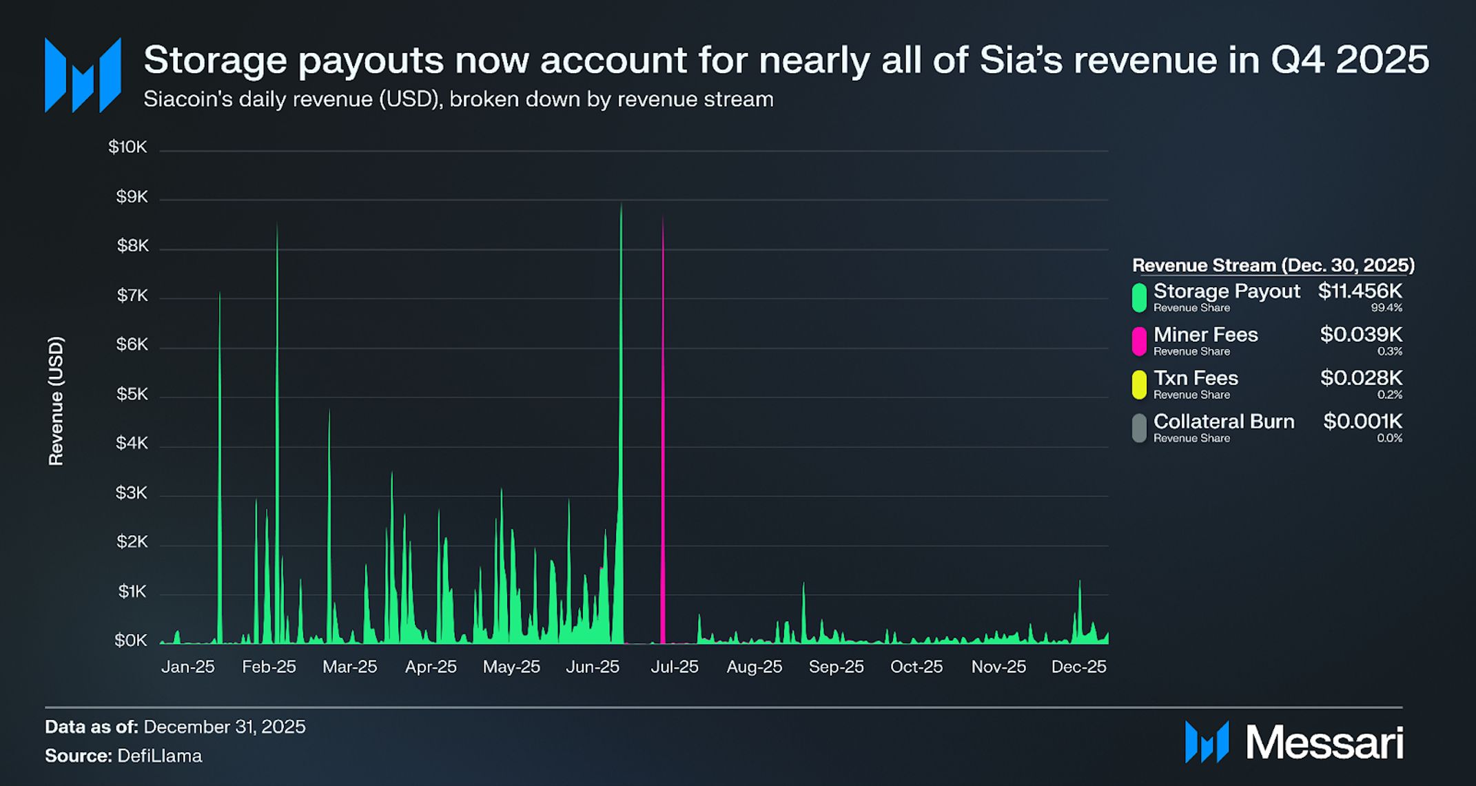 2025년 4분기의 수익 구성은 스토리지 지급이 주요 수익원인 시아의 역사적 패턴으로 복귀했다. 2025년 3분기에는 V2 마이그레이션 활동으로 수익이 왜곡되었으며, 계약 전환 및 갱신 메커니즘이 채굴자 수수료의 급증을 주도하고 스토리지 수익이 인식되는 시점을 변화시켰다. 마이그레이션이 완료되면서 채굴자 수수료와 트랜잭션 수수료는 정상 수준으로 복귀했다.