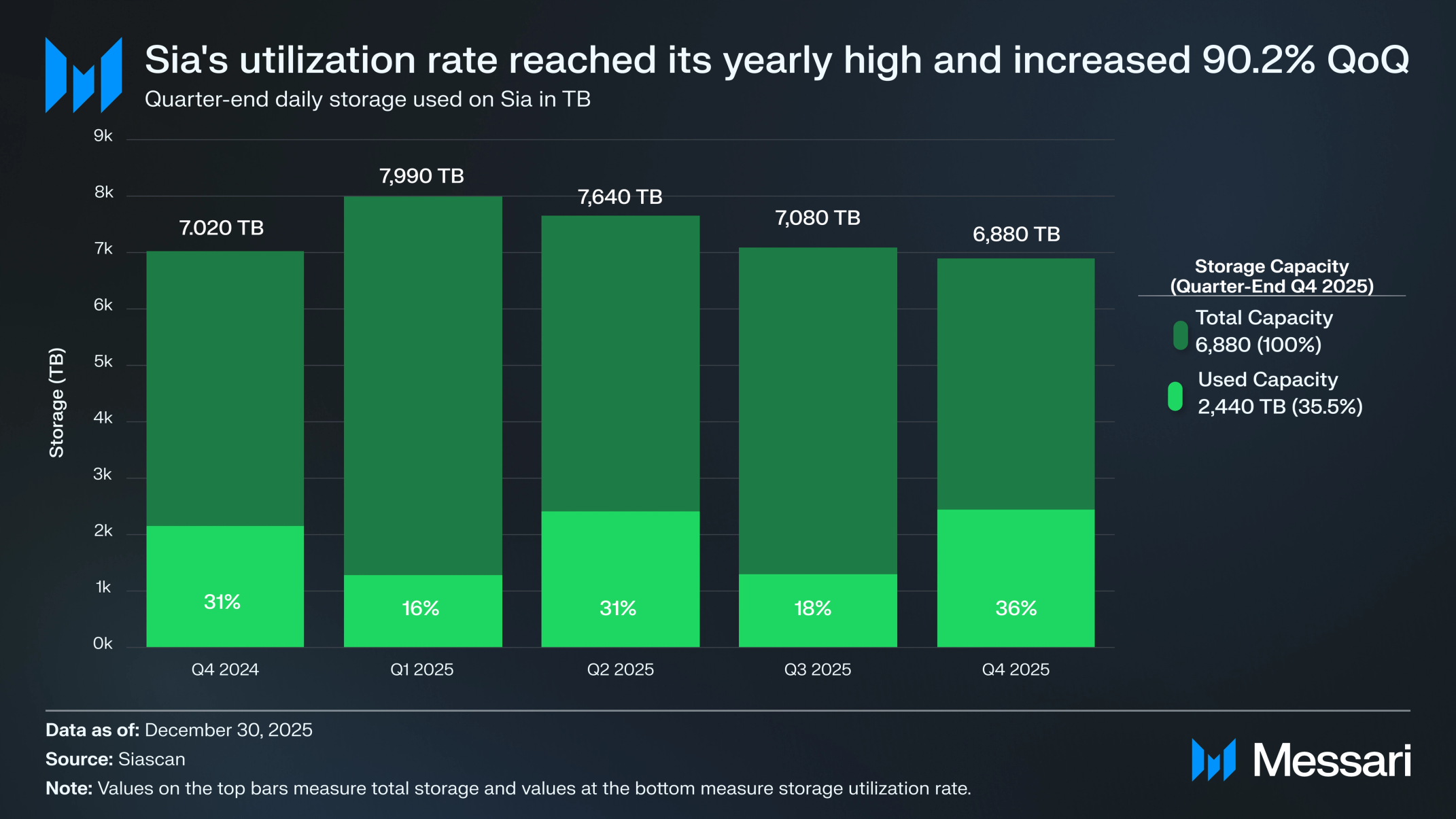 시아의 스토리지 활용률은 V2 업그레이드 이후 네트워크가 안정화되면서 2025년 4분기에 증가했다. 저장된 총 데이터는 1,280TB에서 2,440TB로 증가했으며, 이는 전분기 대비 90.2% 증가를 나타낸다. 한편 총 가용 스토리지 용량은 3분기 8,080TB에서 6,880TB로 감소했다. 이를 종합하면 활용률은 3분기 18.1%에서 35.5%로 상승했다.