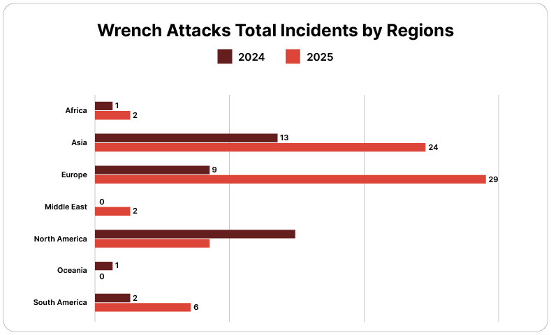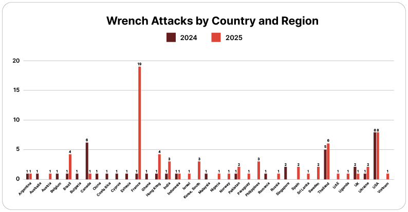 지역별 렌치 공격 비중 변화를 살펴보면, 북미는 2024년 36.6%에서 2025년 12.5%로 크게 하락했으며, 사건 수 역시 15건에서 9건으로 감소했습니다. 이는 미국이 더 안전해졌다는 의미라기보다는, 전 세계 다른 지역에서 공격 규모가 확대되면서 상대적 비중이 낮아진 결과로 해석하는 것이 타당합니다.