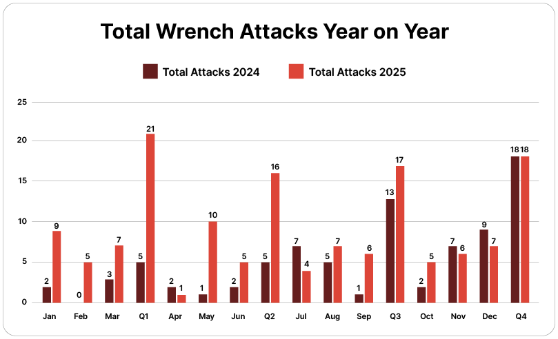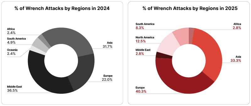 2025년, 이른바 ‘렌치 공격(wrench attacks)’은 암호화폐 보유자에게 실질적이고 구조적인 위협으로 자리 잡았습니다. 이는 물리적 폭력이 더 이상 예외적인 사건이 아니라 디지털 자산 소유에 내재된 구조적 리스크임을 분명히 보여줍니다. 이러한 위협 양상은 기회적 범죄에서 벗어나, 고도로 조직화된 초국가적 범죄 활동으로 전환되었습니다. 공격자들은 이제 오픈소스 정보(OSINT) 기반 표적화, 사회공학, 그리고 극단적인 물리적 폭력을 결합해 개인 키를 탈취하고 있습니다.