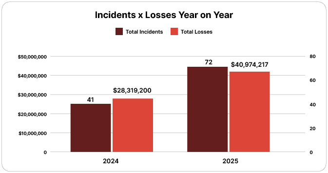 2024년에는 총 41건의 물리적 공격 사건이 기록되었고, 총 피해액은 약 2,830만 달러였습니다. 2025년에는 사건 수가 72건으로 증가하면서 피해액이 4,090만 달러를 초과해, 탈취 금액 기준 44% 증가를 기록했습니다.