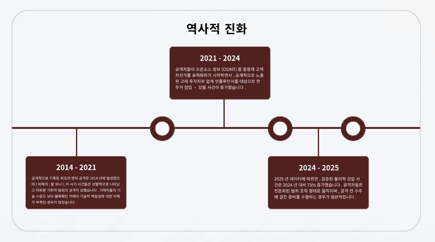암호화폐와 관련된 물리적 폭력 범죄는 기회적 절도에서 벗어나, 산업화·초국가화된 조직 범죄로 진화해 왔습니다.