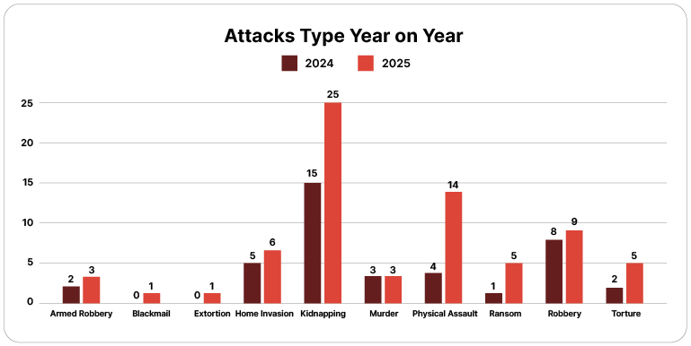 물리적 강압 공격은 기회적 범죄에서 벗어나 고도로 조직화된 갈취·강압 범죄로 진화했습니다. 2025년에 보고된 72건의 사건 중 납치는 해당 연도의 주요 공격 벡터로, 25건이 발생했습니다. 이는 2024년 15건에서 66% 증가한 수치입니다. 또한 폭력적 공격(신체적 폭행, Physical Assault) 역시 2024년 4건에서 2025년 14건으로 늘어나며, 250% 증가를 기록했습니다.