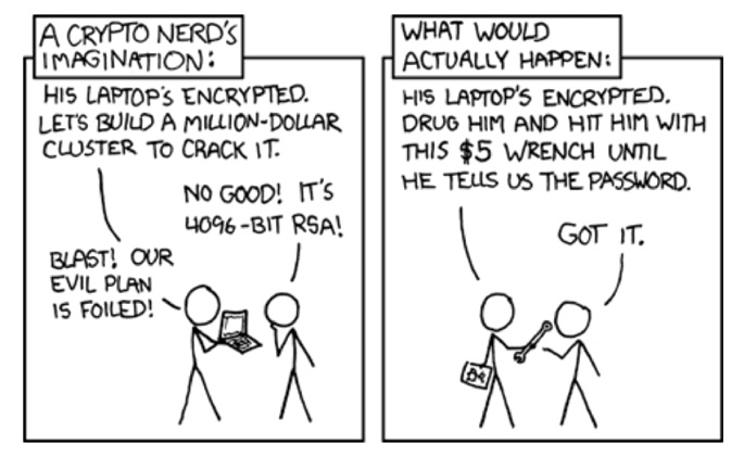 디지털 자산 보안 분야에서 ‘렌치 공격’이란, 공격자가 폭력, 협박, 또는 감금 등 물리적 강압 수단을 통해 피해자로 하여금 개인 키 또는 비밀번호를 넘기도록 강요하는 사건을 의미합니다. 이 용어는 xkcd 웹툰(538화)에서 유래했으며, 해당 작품은 4096비트 RSA와 같은 정교한 암호화도 슈퍼컴퓨터보다 ‘5달러짜리 렌치’로 더 손쉽게 무력화될 수 있다는 풍자를 통해 물리적 강압의 현실적 위협을 강조했습니다.