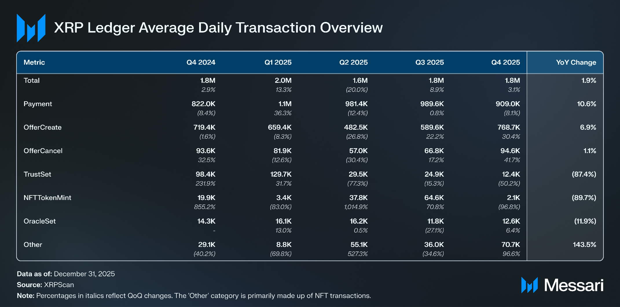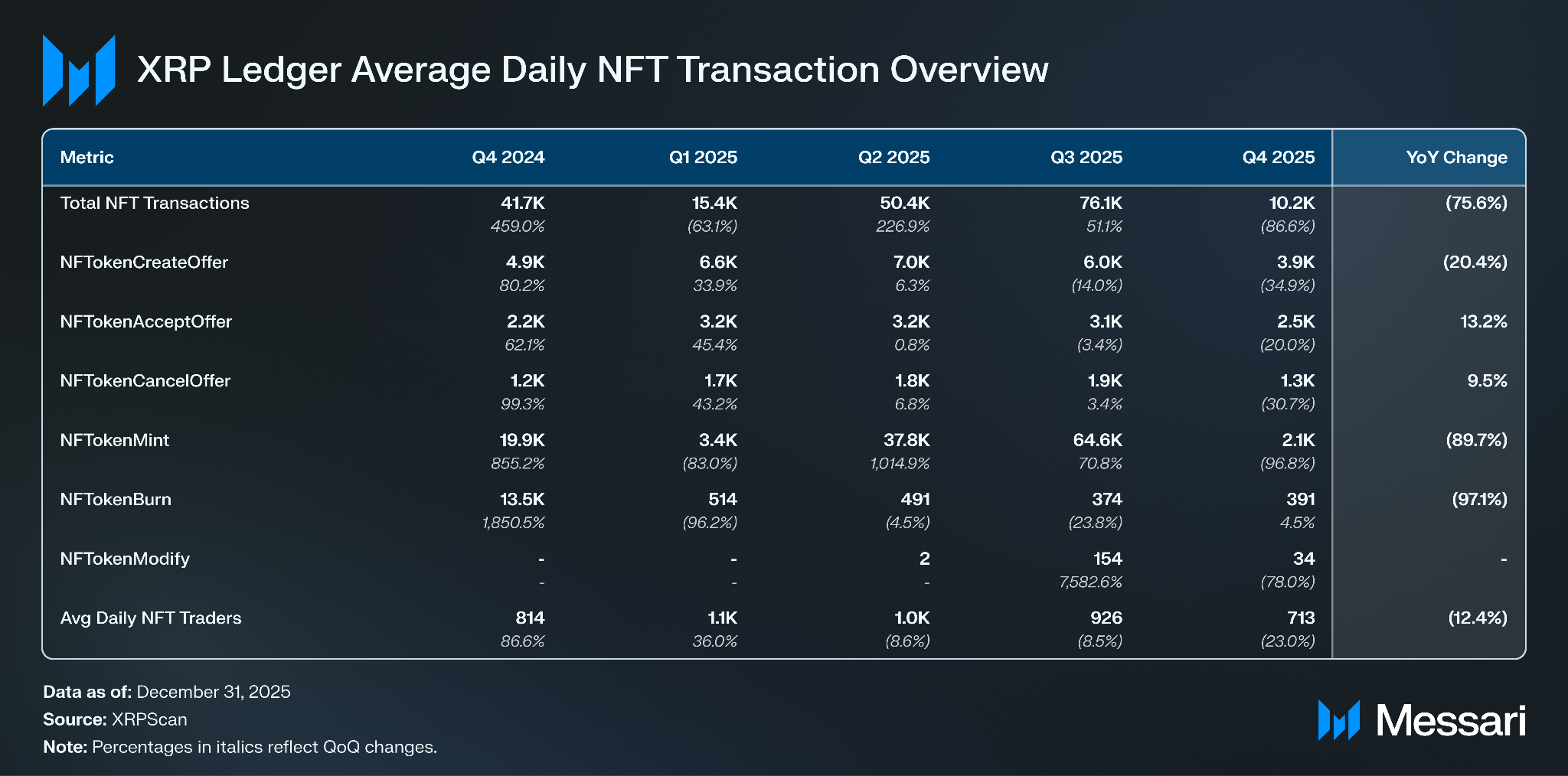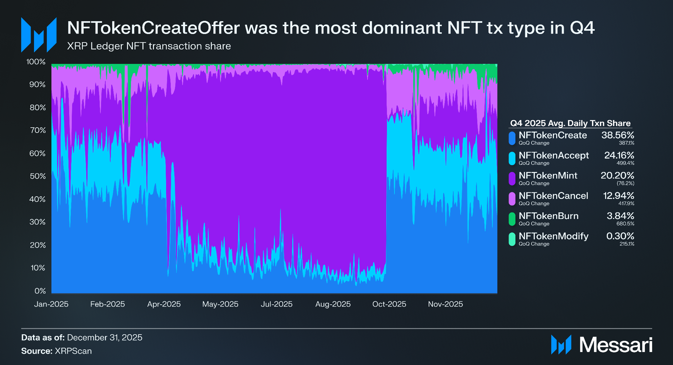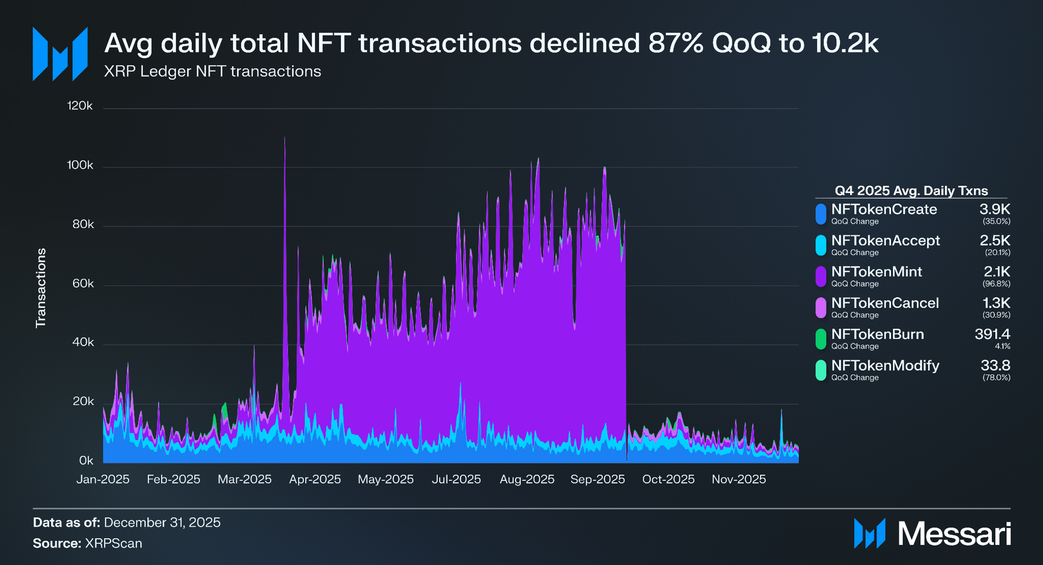 4분기에 NFT 민트 거래 감소로 인해 NFT토큰크리에이트오퍼(NFTTokenCreateOffer)가 가장 일반적인 거래 유형이 되었다. 4분기 말 기준, 거의 1,900만 개의 NFT가 XLS-20 표준으로 민팅되었다. 주목할 점은 해당 민트 중 420만 개가 2025년 3분기에, 340만 개가 2025년 2분기에 발생했다는 점이다.