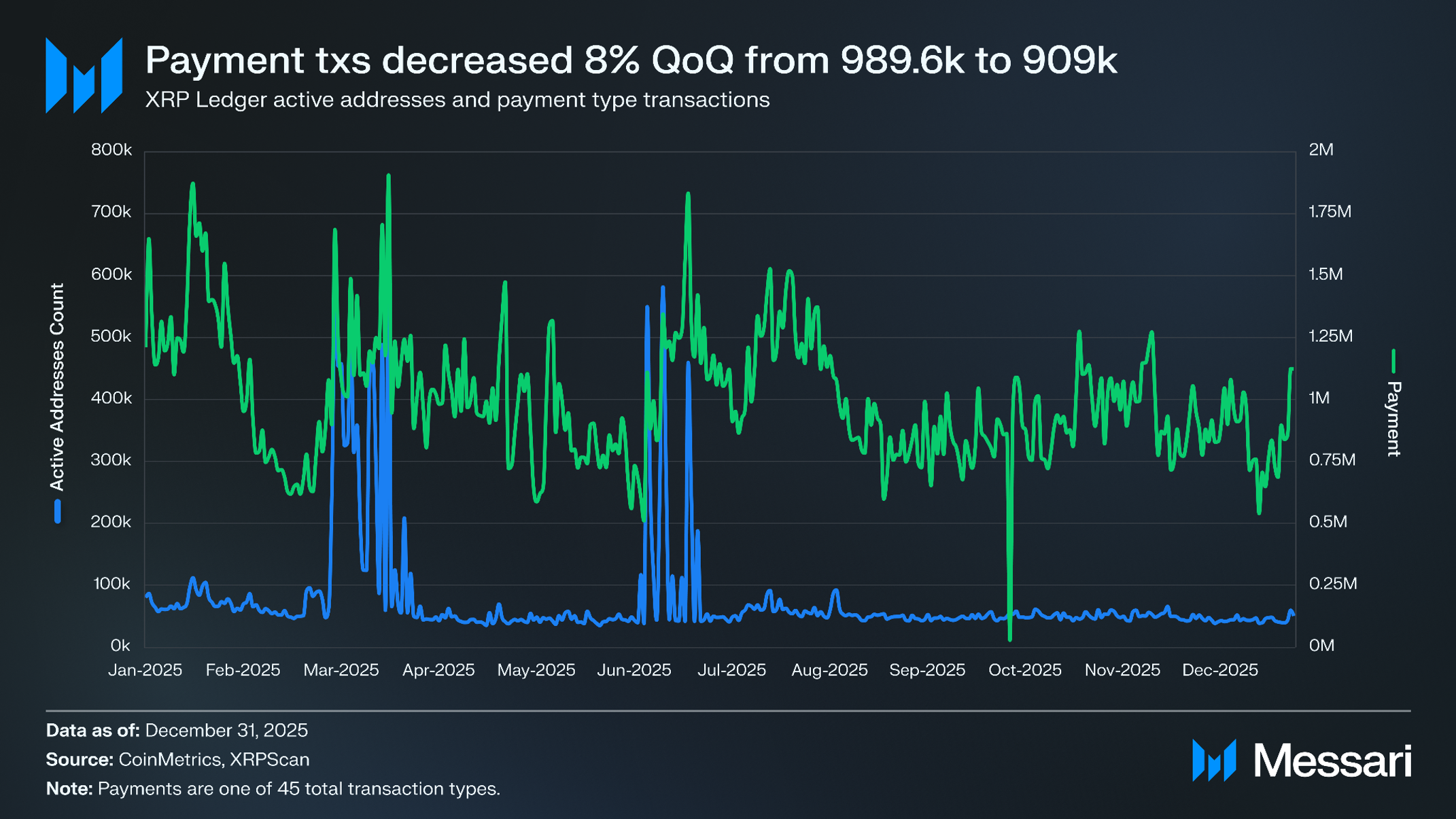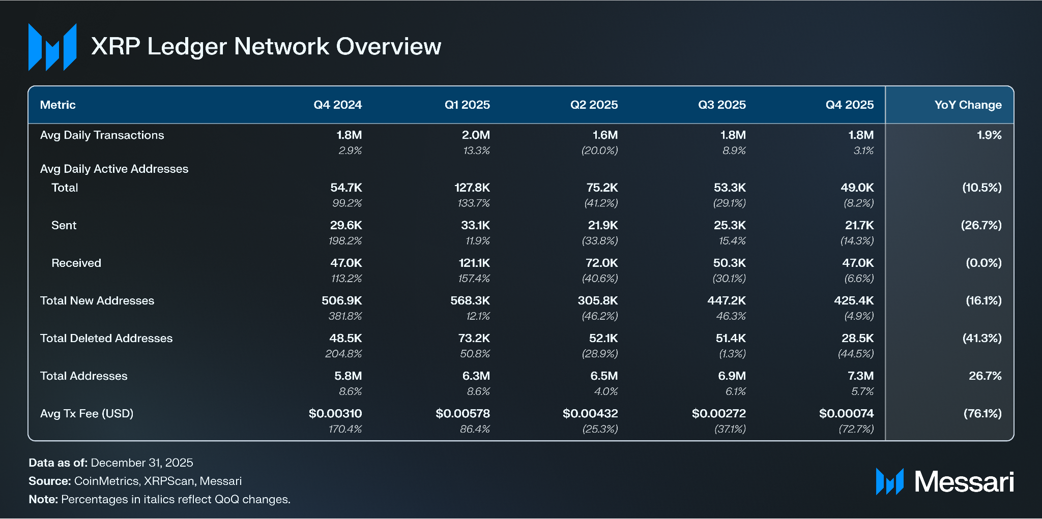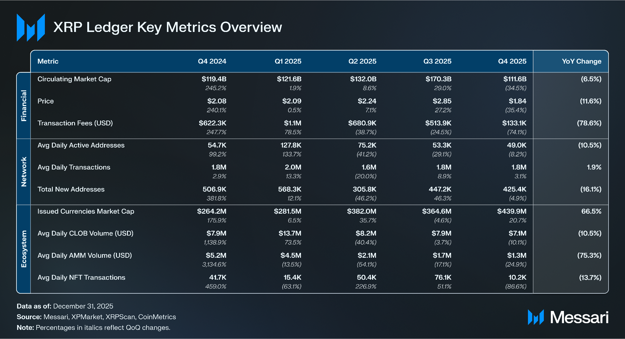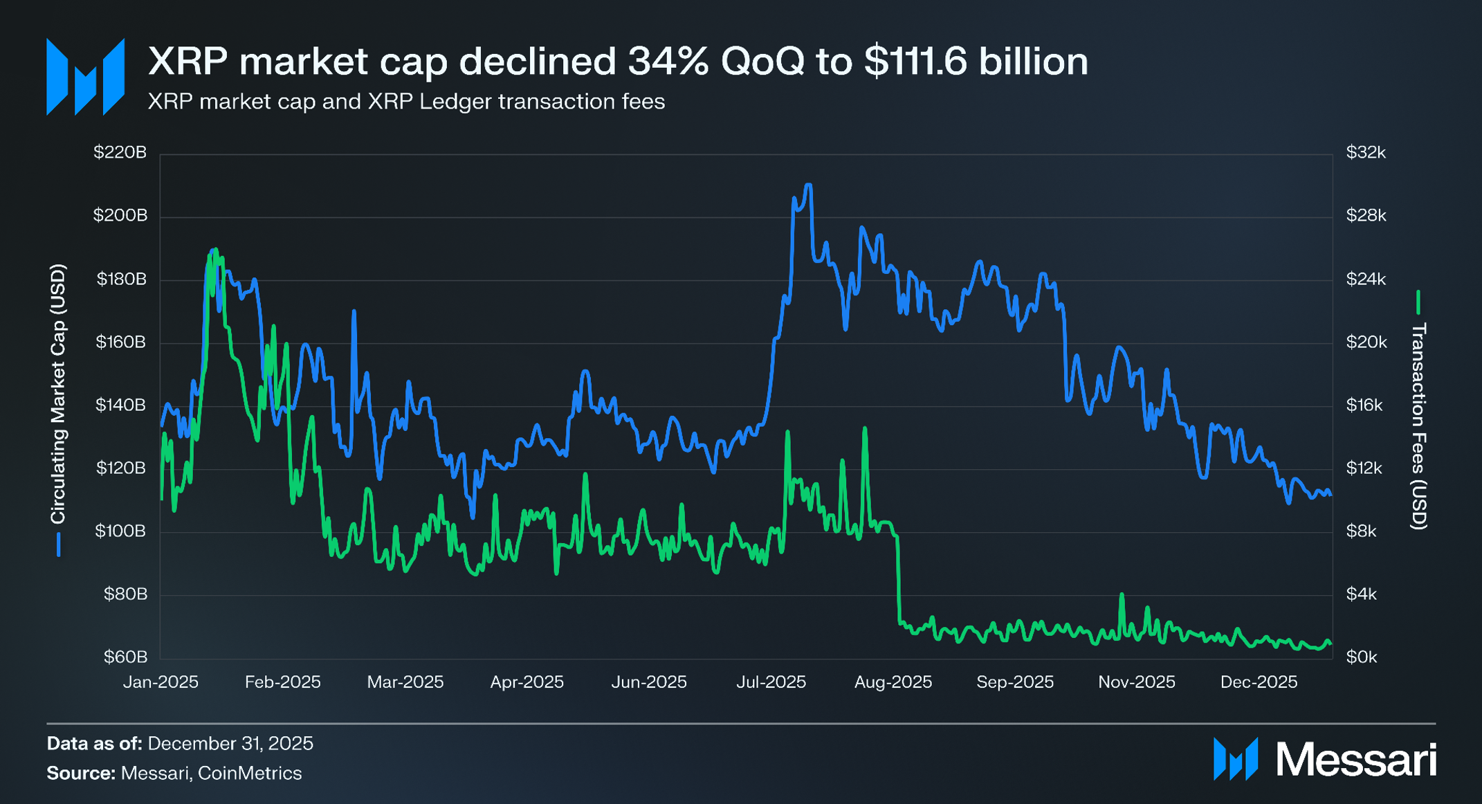 XRP는 2025년 4분기를 시가총액 기준 다섯 번째로 큰 암호화폐로 1,116억 달러(전분기 대비 -34.5%)로 마감했으며, BTC, ETH, SOL의 합산 시가총액보다 저조한 성과를 보였다. 해당 합산 시가총액은 전분기 대비 24.4% 감소했다. XRP의 가격은 전분기 대비 35.4% 하락한 1.84달러를 기록했으며, 시가총액과 가격 간의 차이는 순환 공급량이 1.4% 증가했기 때문이다.