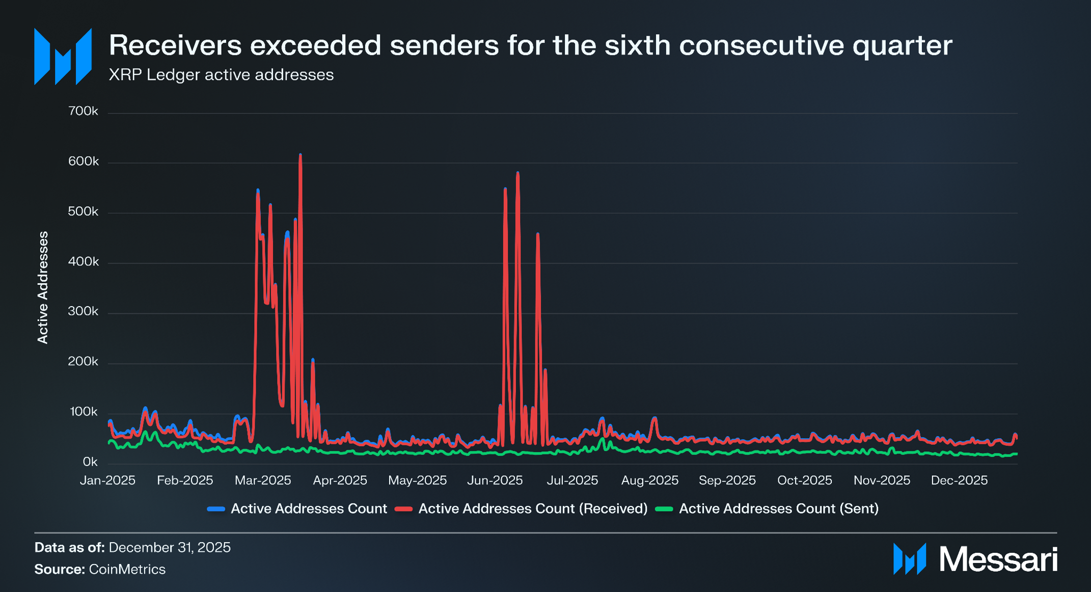6분기 연속으로 XRPL에서 활성 수신자 주소가 활성 발신자 주소를 초과했다. 일평균 수신자는 전분기 대비 6.6% 감소하여 5만 300개에서 4만 7,000개로 줄었으며, 일평균 발신자는 15.4% 감소하여 2만 5,300개에서 2만 1,700개로 줄었다. 활성 수신자 지표는 전송 또는 기타 거래를 수신하는 주소 수에 의해 결정된다. 수신자가 발신자를 능가하면 이전에 비활성 상태였던 지갑이 발신자가 분배하는 토큰을 수신하는 것보다 발신자가 해당 토큰을 분배하는 수가 더 많다는 것을 나타낸다.