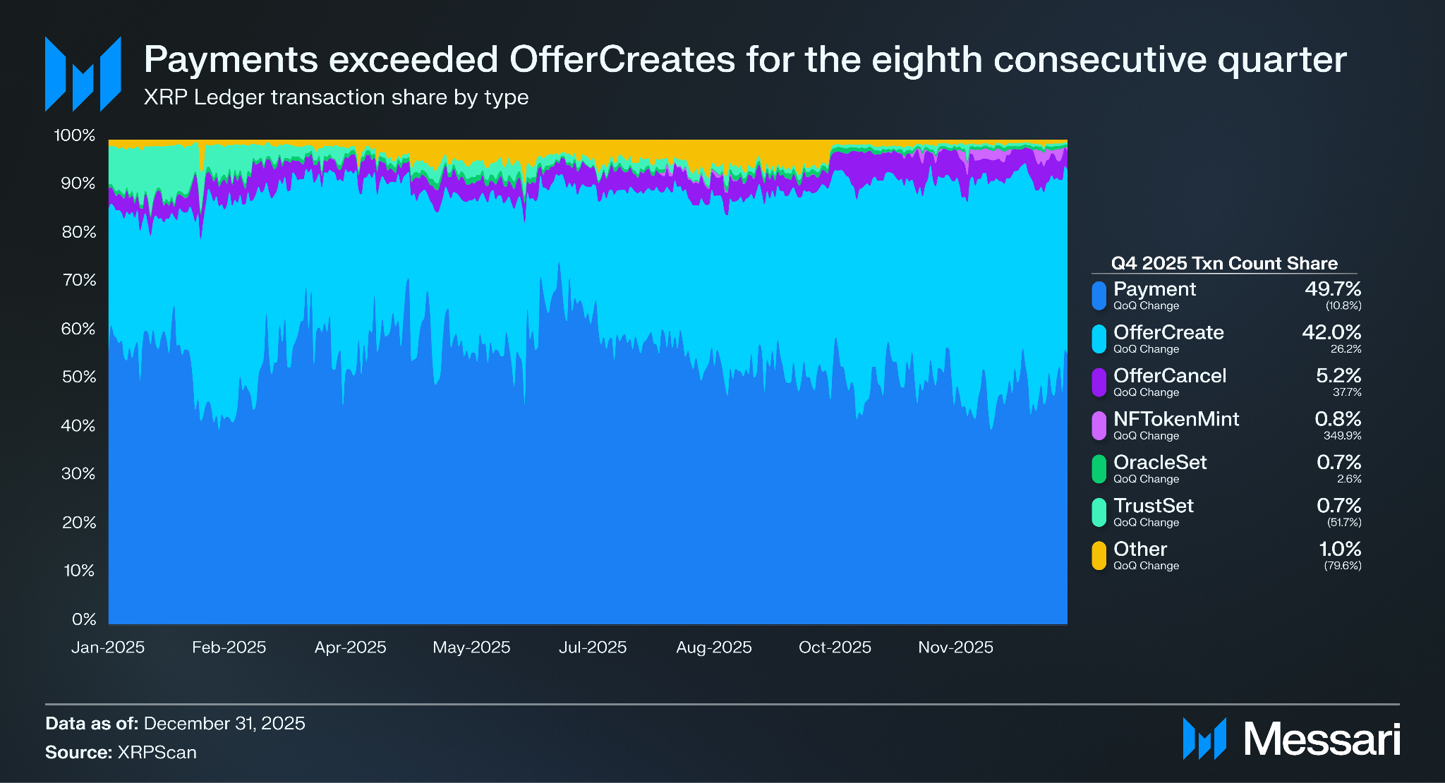 지난 5개 분기 각각에서 결제와 오퍼크리에이트(OfferCreate)가 XRP 레저 거래의 대부분을 차지했다.