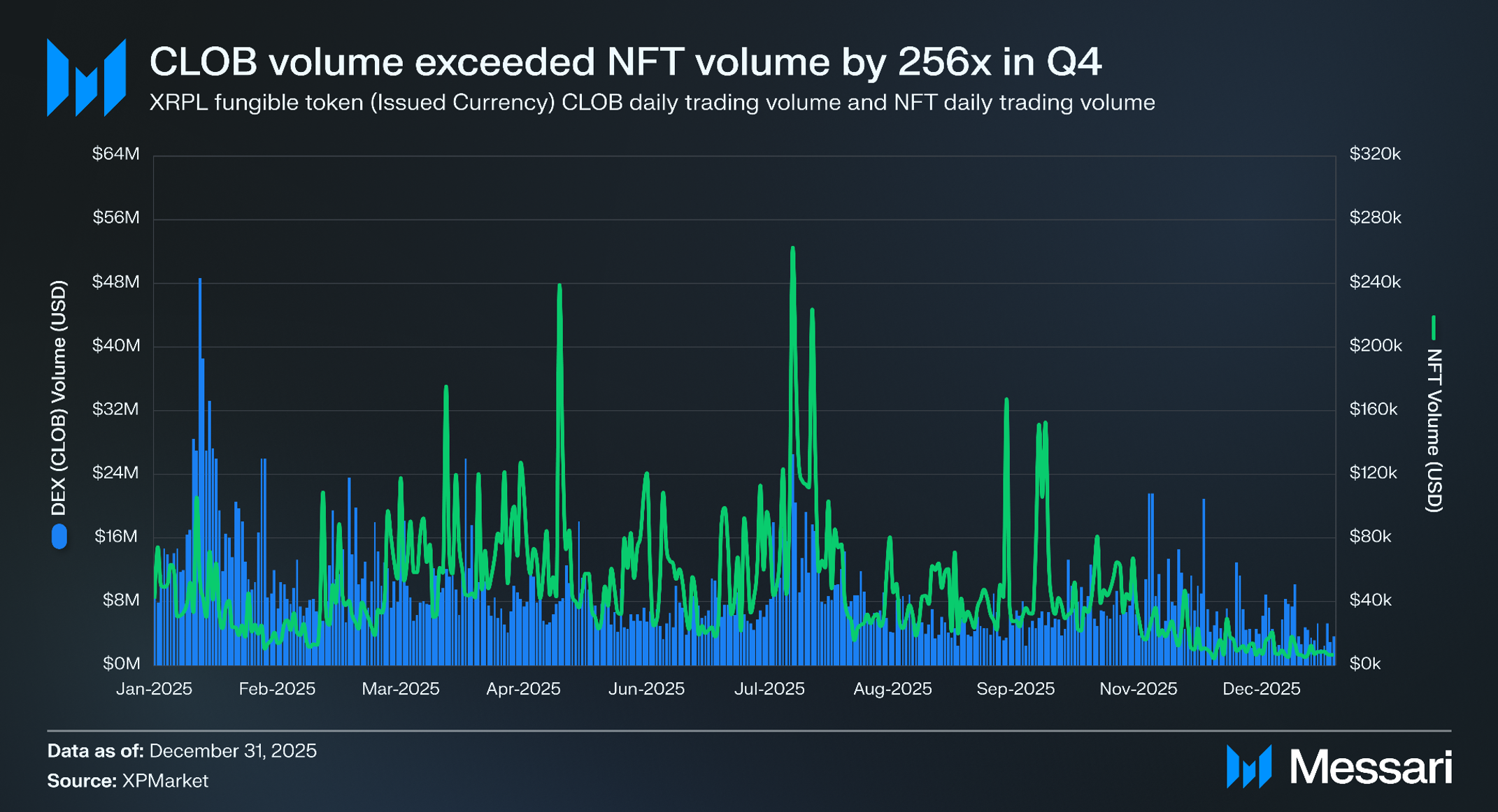 4분기에 일평균 CLOB 거래량은 NFT 거래량을 256배 초과했으며(6억 4,960만 달러 대 250만 달러), CLOB 거래량이 NFT 거래량을 최소 90배 초과한 다섯 번째 연속 분기가 되었다. XRPL의 이러한 지속적인 추세는 대체 가능한 토큰 거래량이 대체 불가능한(NFT) 거래량보다 기하급수적으로 큰 다른 주요 암호화폐 네트워크 전반의 광범위한 추세와 일치한다.