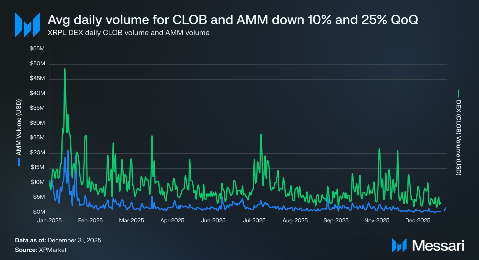 2024년 11월 30일 6,050만 달러의 거래량으로 정점을 찍은 후 일일 AMM 거래량은 1분기와 2분기에 연속적으로 낮은 고점으로 꾸준히 감소했다. 9월 16일 3분기 일일 최고치인 530만 달러로 급등한 후 4분기에 지속적으로 감소했다. 결과적으로 일평균 AMM 거래량은 전분기 대비 24.9% 감소하여 3분기 170만 달러에서 4분기 130만 달러로 줄었다.