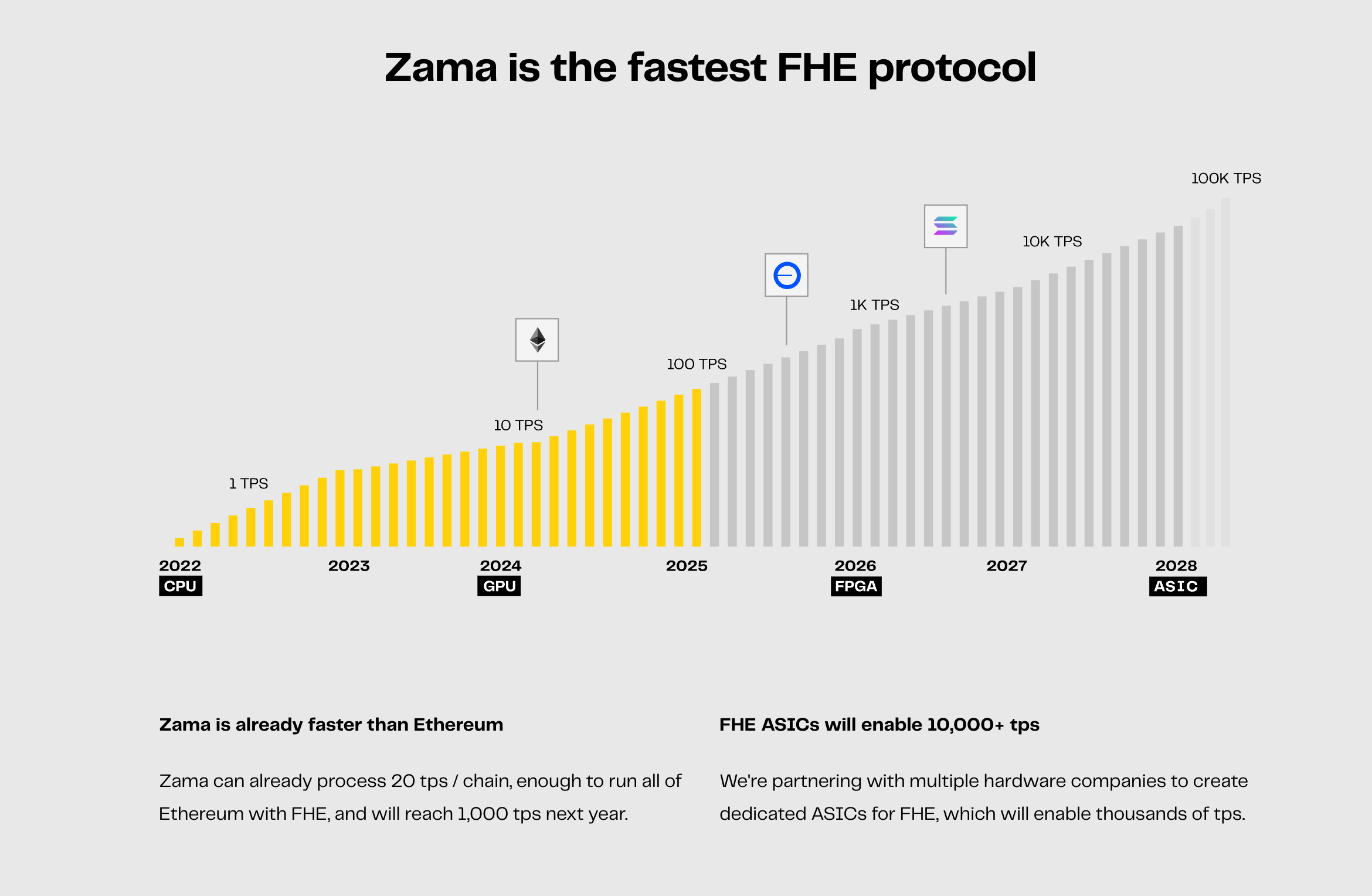 비트코인 채굴이 CPU에서 ASIC으로 옮겨가며 연산력이 폭발했듯, FHE 역시 전용 하드웨어의 등장을 전제로 합니다. Zama는 2027~2028년을 목표로 FHE 전용 ASIC 개발을 추진 중이라고 밝히고 있습니다. 하드웨어 가속이 현실화될 경우, 현재 병목이 크게 줄며 처리량이 도약할 가능성은 있습니다.