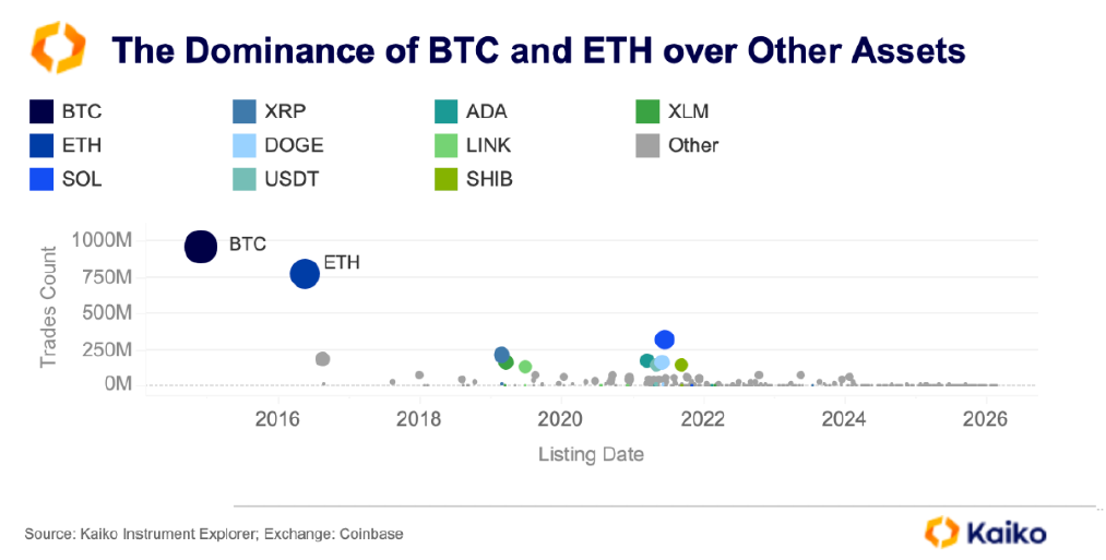 데이터는 나머지 시장 대비 현저히 큰 격차로 코인베이스에서의 BTC와 ETH 지배력을 재차 확인해준다. 이러한 집중 현상은 코인베이스의 경제적 성과가 주로 BTC와 ETH 활동에 연동됨을 의미한다. 두 자산이 거래 상호작용의 대부분을 차지하고, 따라서 대부분의 수익화 기회를 점유하기 때문이다. 결과적으로 수많은 신규 자산을 추가하더라도 수익 기반에는 미미한 영향만 미친다. 신규 상장은 고객 유치 및 유지 측면에서 전략적으로 중요하지만, 거래가 BTC와 ETH 위주로 지속되는 한 실적을 실질적으로 바꾸지는 않는다.