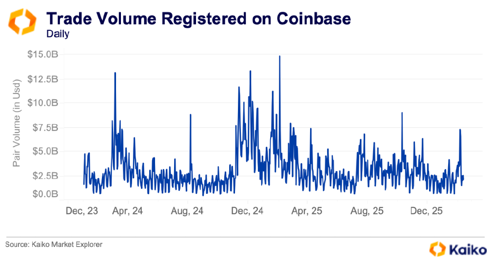 • 코인베이스의 거래량은 변동성이 매우 높으며, 거시경제 환경과 밀접하게 연동된다.