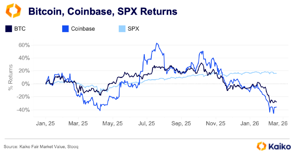 2025년 1월부터 2026년 3월 초까지 BTC, 코인베이스, SPX의 누적 성과를 비교한 결과, 코인베이스는 암호화폐 사이클에 대한 간접적 노출을 제공하되 민감도가 증폭된 형태임을 확인할 수 있다. 반면 SPX는 훨씬 일관된 궤적을 보이며 전반적으로 양의 성과를 유지하고 있어, BTC/코인베이스에서 관찰되는 약세가 거시적 움직임이 아닌 암호화폐 고유의 현상임을 시사한다.