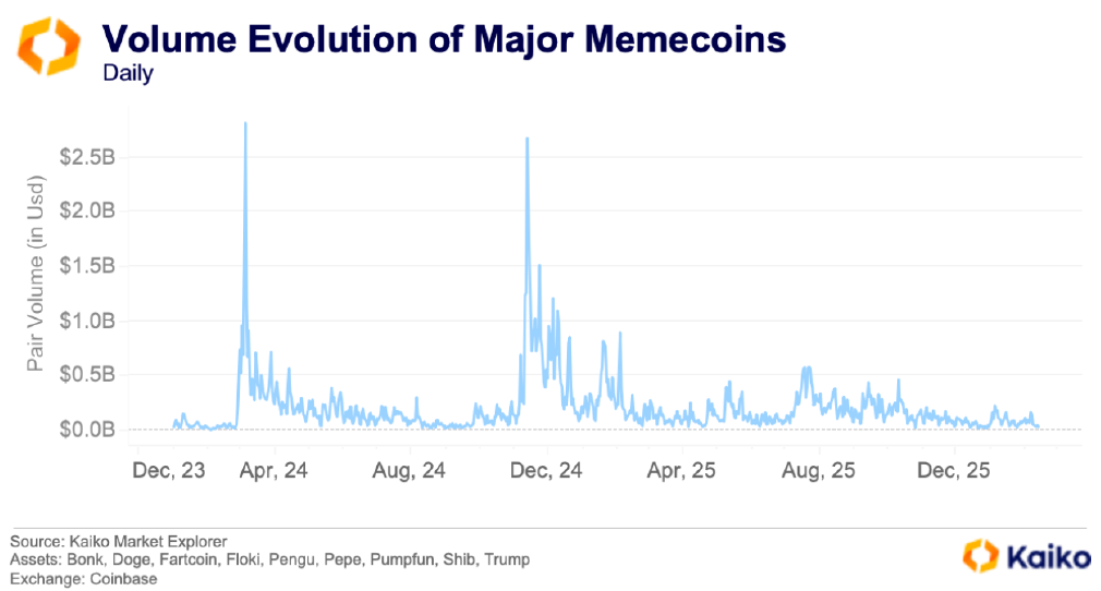 코인베이스에서의 과열 활동은 주요 밈코인(memecoin)에 집중되며, 이러한 동반 급등은 플랫폼 전체 거래량 스파이크와 밀접하게 연동된다. 이는 거래 활동이 소수 자산에 집중되고, 거래량의 가장 큰 급등이 광범위한 시장 랠리보다는 내러티브 주도 국면에 의해 더 잘 설명된다는 뚜렷한 집중 역학을 시사한다. 이런 맥락에서 소매 참여에 가장 민감한 세그먼트인 밈코인은 위험선호도와 사이클 모멘텀의 실질적인 바로미터 역할을 한다.
