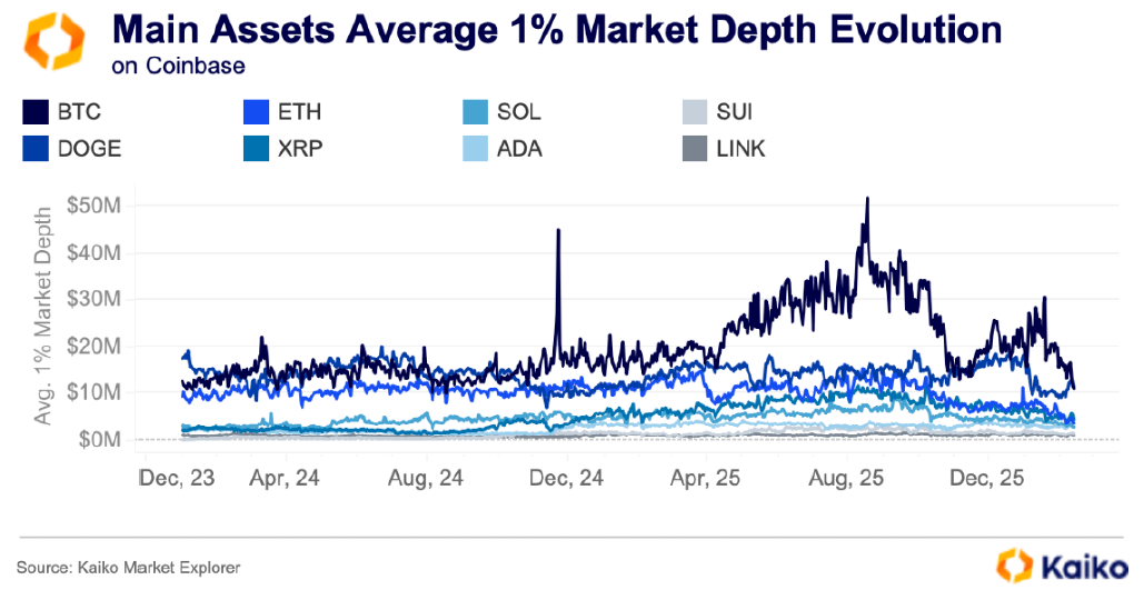 마지막으로, 코인베이스의 실행 가능 유동성은 호가창 깊이를 통해 측정한다. 이는 가격을 크게 움직이지 않으면서 주문을 소화할 수 있는 시장의 역량을 나타낸다. 관찰 기간 동안 유동성 환경은 뚜렷한 국면에 걸쳐 의미 있게 변화했으며, 최근에는 여러 자산에 걸쳐 급격한 악화가 나타나 타이트한 체결 환경을 시사한다. 호가창 깊이가 깊을 경우 체결 품질 향상으로 코인베이스는 대규모 주문 처리에 더 유리해지는 반면, 깊이가 줄어들면 슬리피지 증가와 함께 보다 취약한 거래 환경이 조성되는 경향이 있다.
