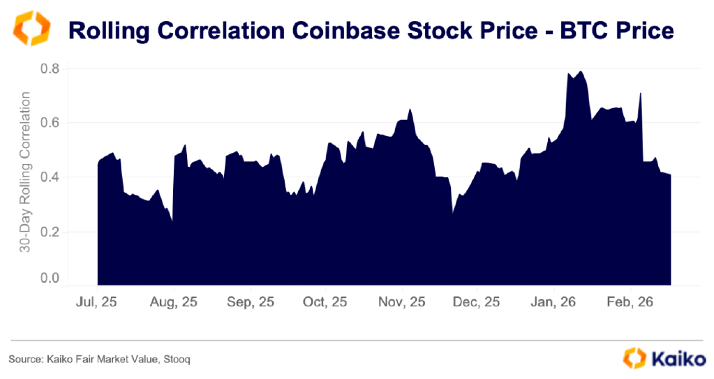 코인베이스 주가와 비트코인(Bitcoin) 가격 간의 관계는 정량화 가능하며 시간에 따라 변화한다. 관찰 기간 동안 상관관계는 구조적으로 양(+)의 방향을 보이며, 코인베이스 주가가 BTC와 같은 방향으로 움직임을 확인할 수 있다. 이 상관관계는 일관되고 강하게 양의 값을 유지하며, 코인베이스의 움직임을 이해하려면 BTC의 움직임도 함께 모니터링해야 한다는 점을 뒷받침한다.