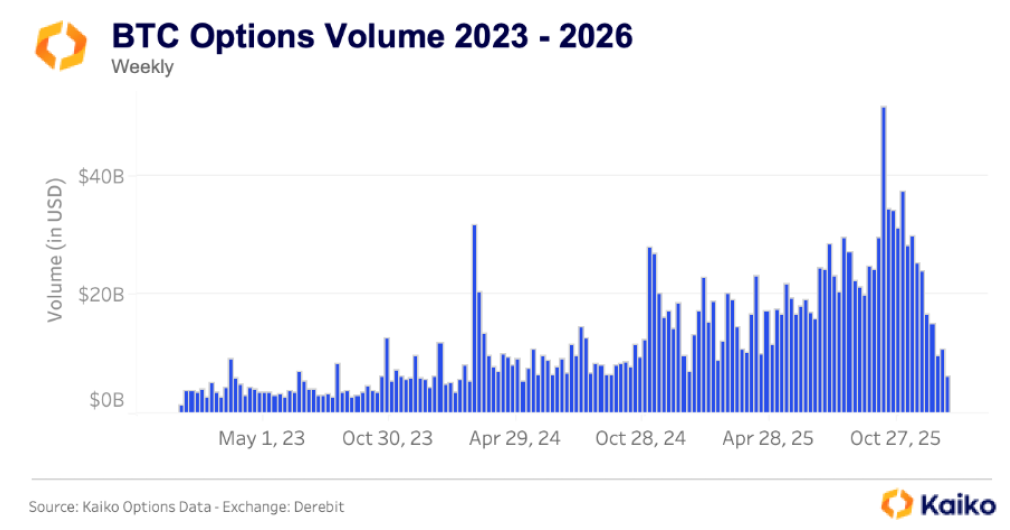 2026년 초 BTC와 ETH의 미결제약정(open interest)이 급격히 감소한 것은 숏 포지션의 빠른 청산을 반영한다. 이는 시장이 익스포저 축소 국면으로 전환됨에 따라 포지셔닝 패턴이 변화하고 있음을 의미하며, 이 급격한 위축은 헤지 수요 감소를 시사할 수 있다. 보다 광범위하게 보면, 미결제약정 하락은 위험 축소 국면과 파생상품에 대한 지속적 수요 약화를 시사한다. 한편 데리비트는 글로벌 암호화폐 옵션 거래에서 가장 큰 시장점유율을 차지하며 이 분야의 지배적 플레이어 위치를 점하고 있다. 이에 따라 2025년 말의 인수는 코인베이스를 파생상품 시장의 주요 강자로 자리매김하게 하며, 기존 현물 거래 영역을 넘어 현물과 파생상품 모두에 대한 종합적 익스포저를 고객에게 제공할 수 있게 된다. 옵션 거래량 성장은 코인베이스의 수익 구조에 특히 중요한 의미를 갖는다.