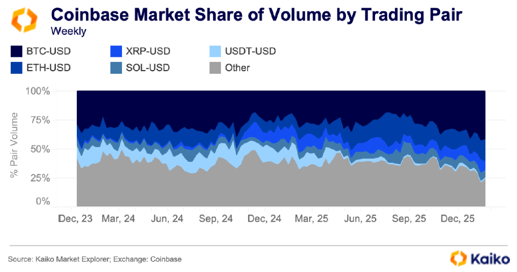 • 코인베이스 활동은 여전히 BTC 및 ETH 거래량이 주도한다.