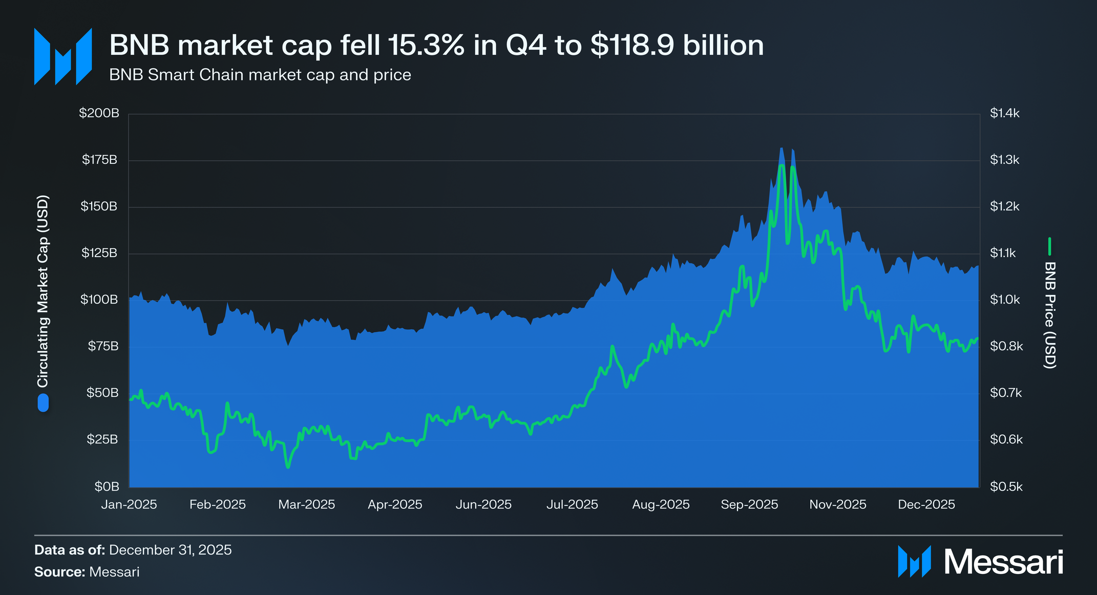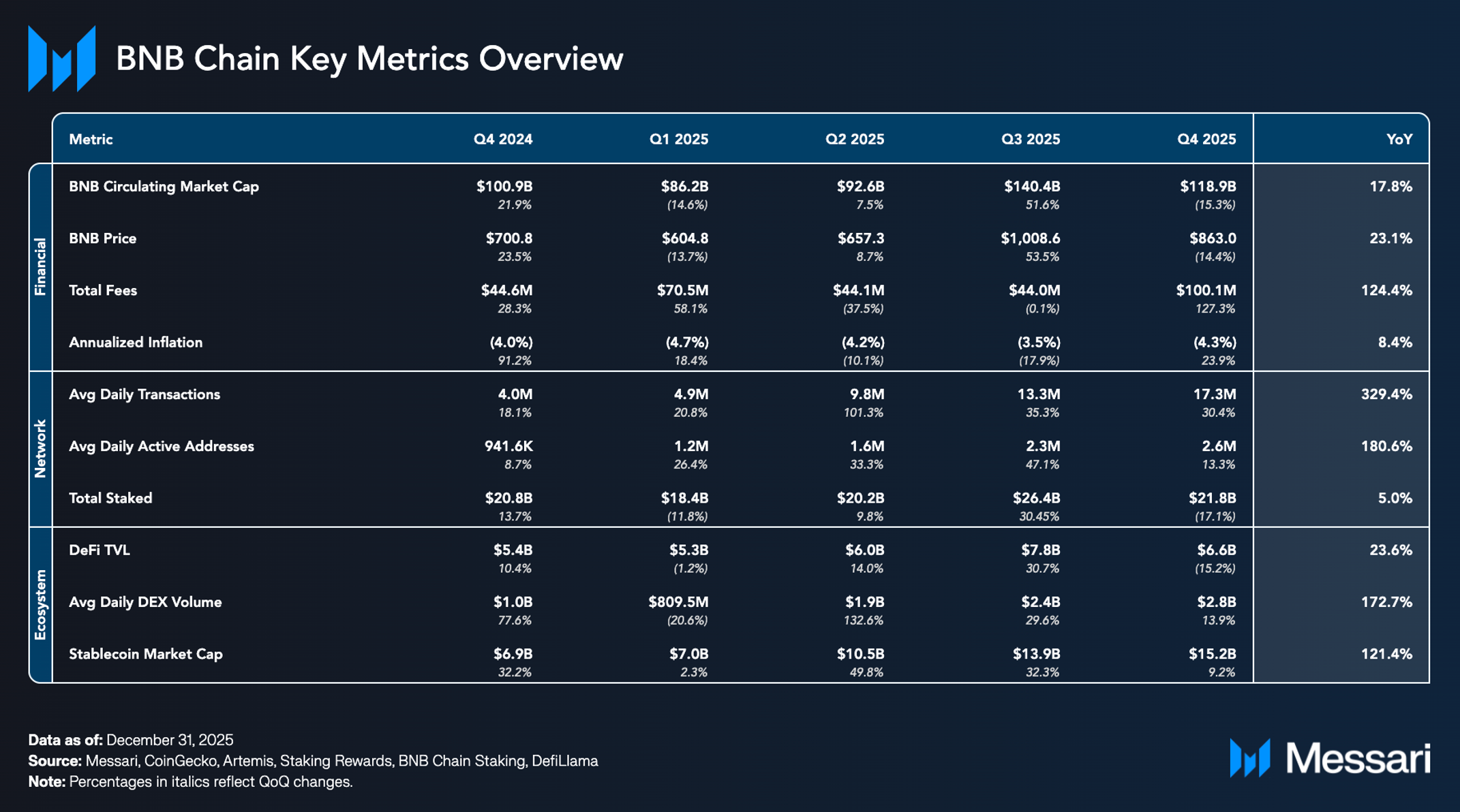 BNB는 연말 기준 863 달러로 마감하며 시가총액 1,189억 달러를 기록해 전년 대비 17.8% 상승했다. 이로써 BNB는 스테이블코인을 제외한 시가총액 기준 세 번째로 큰 암호화폐가 되었다.