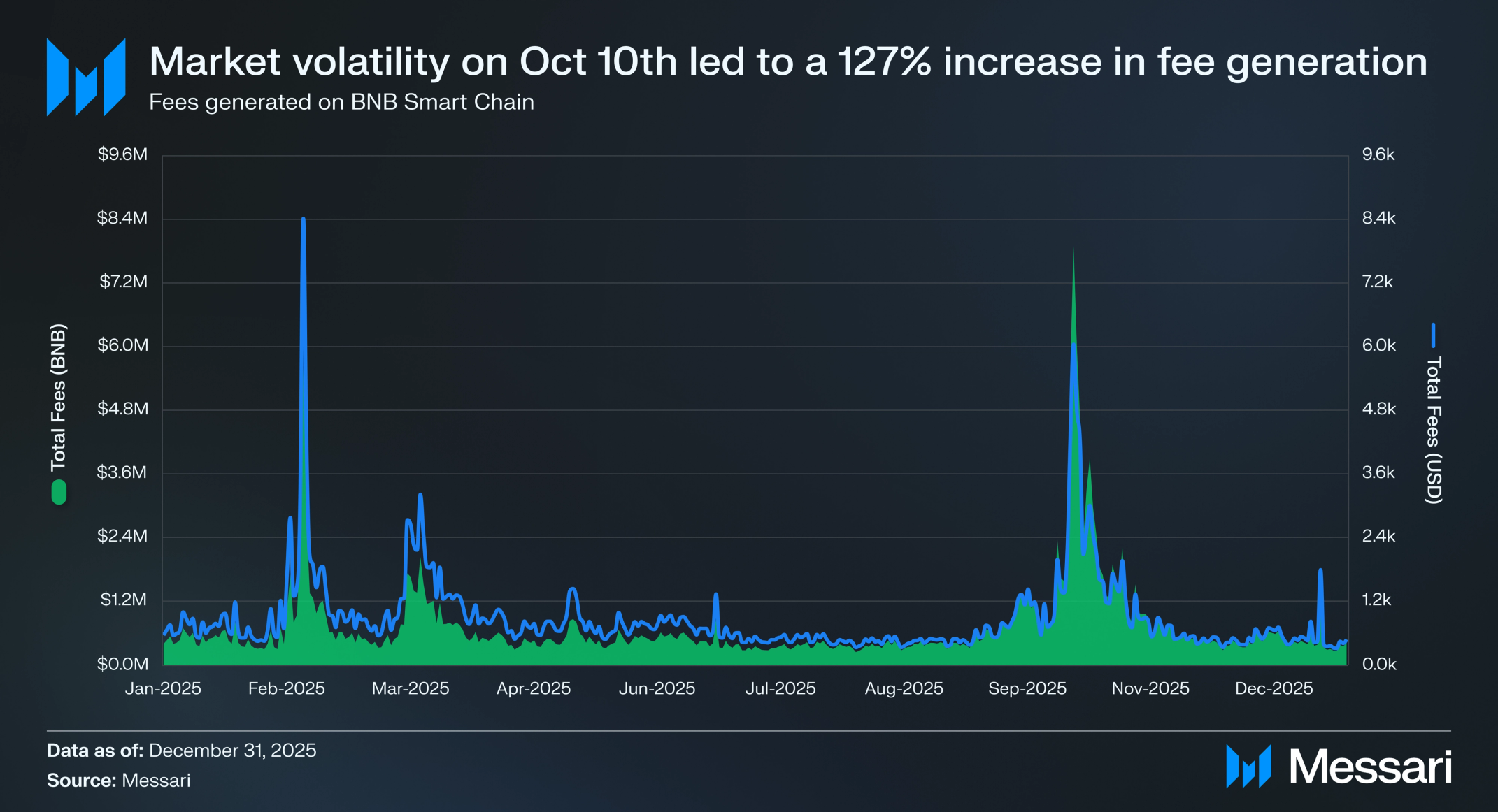 BNB 체인의 수수료 수익은 2025년 4분기에 급격히 반등했으며, 총 수수료는 3분기 4,400만 달러 대비 전분기 대비 127.3% 증가한 1억 100만 달러를 기록했다. 이는 연중 최고 분기 수수료 합계이자 2025년 중반까지 이어진 비교적 평탄한 수수료 환경에서의 명확한 전환을 나타낸다.