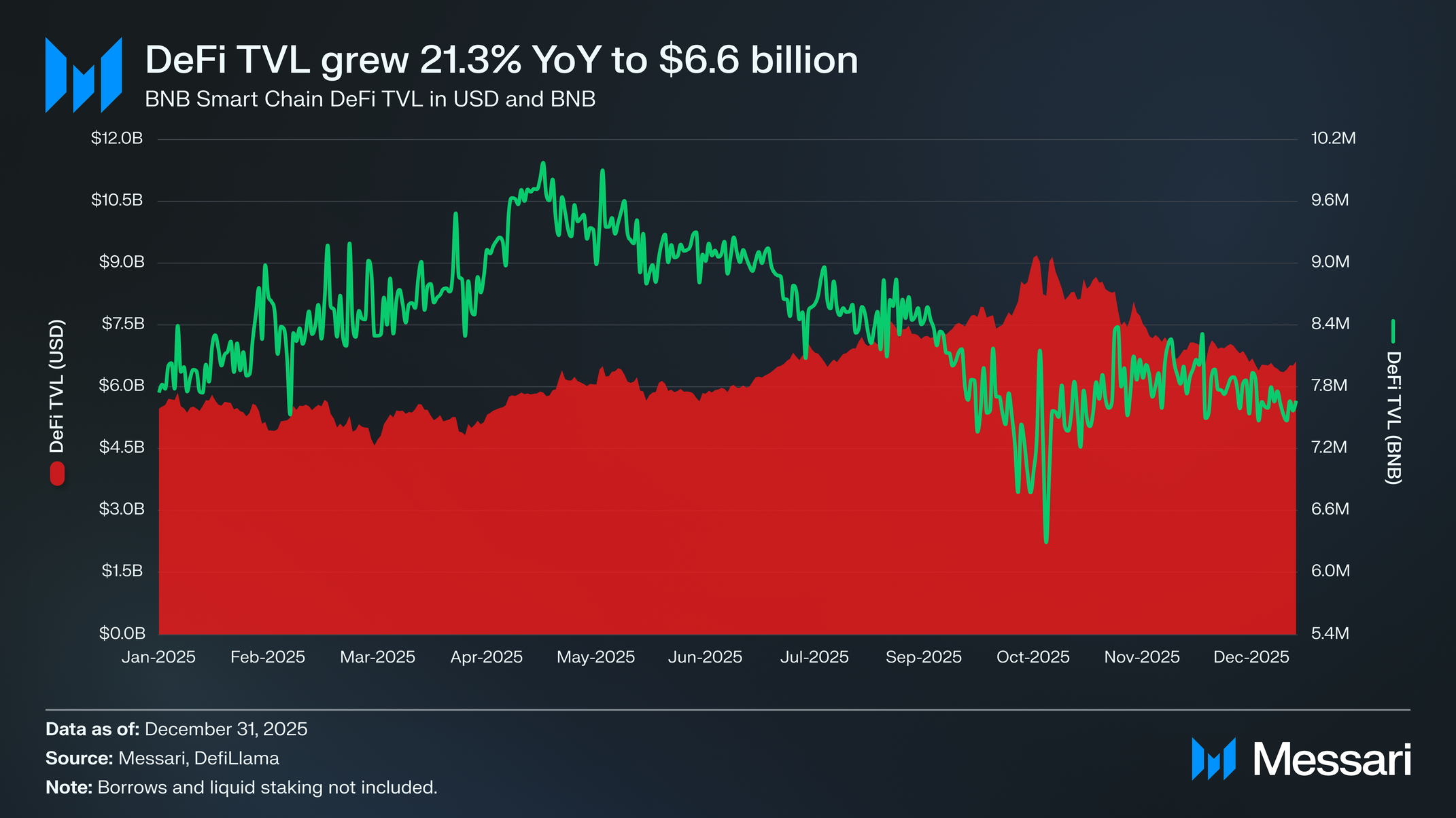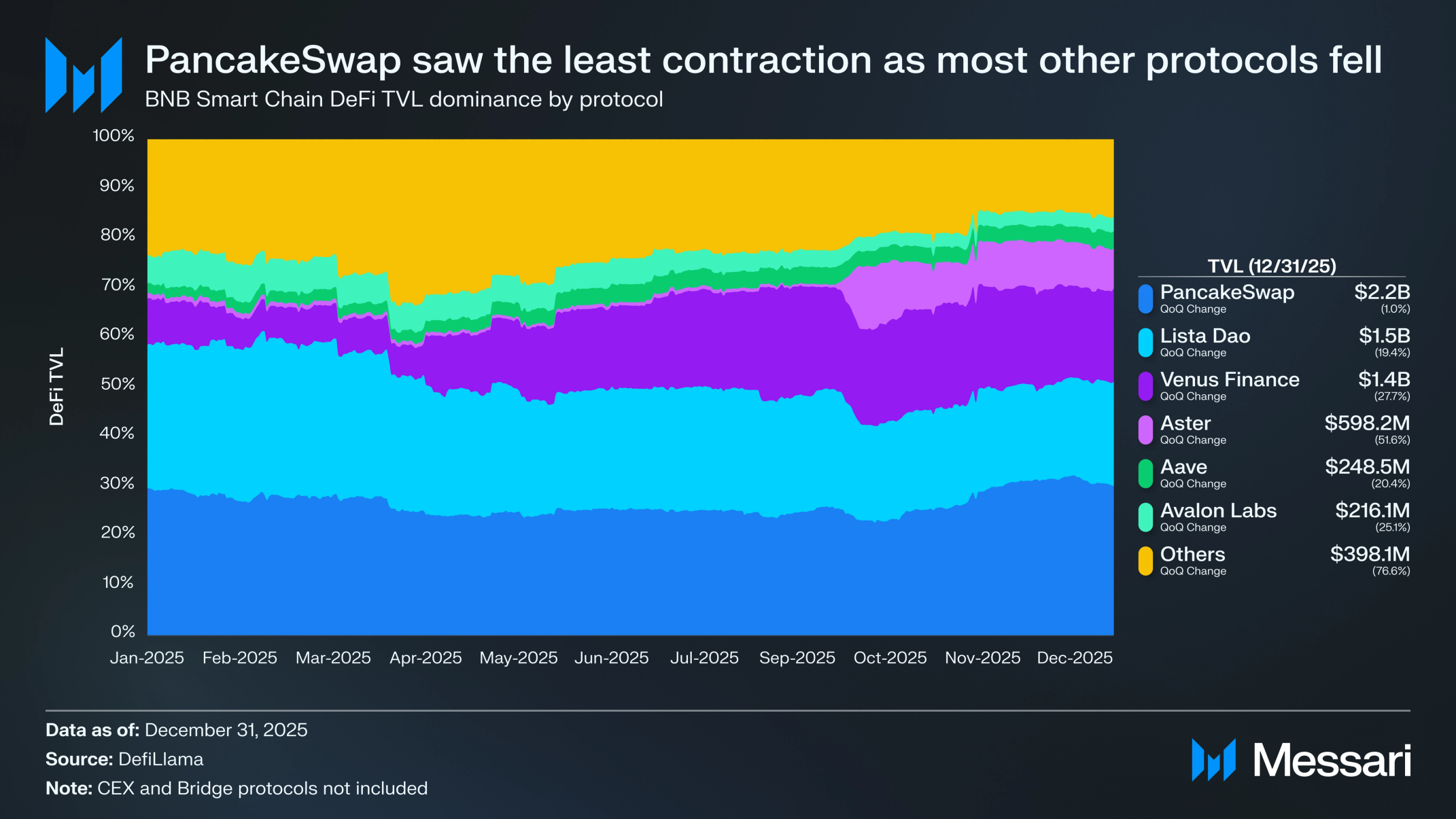 BNB 체인(BNB Chain)은 DeFi TVL 기준 세 번째로 큰 네트워크 지위를 유지했다. 네트워크는 생태계 전반에 걸쳐 66억 달러의 TVL로 한 해를 마감했으며, 전분기 대비 15.2% 감소했지만 전년 대비 23.6% 증가했다. 팬케이크스왑(PancakeSwap)은 총 가치 잠금 22억 달러로 최대 DeFi 상품 지위를 유지했다.