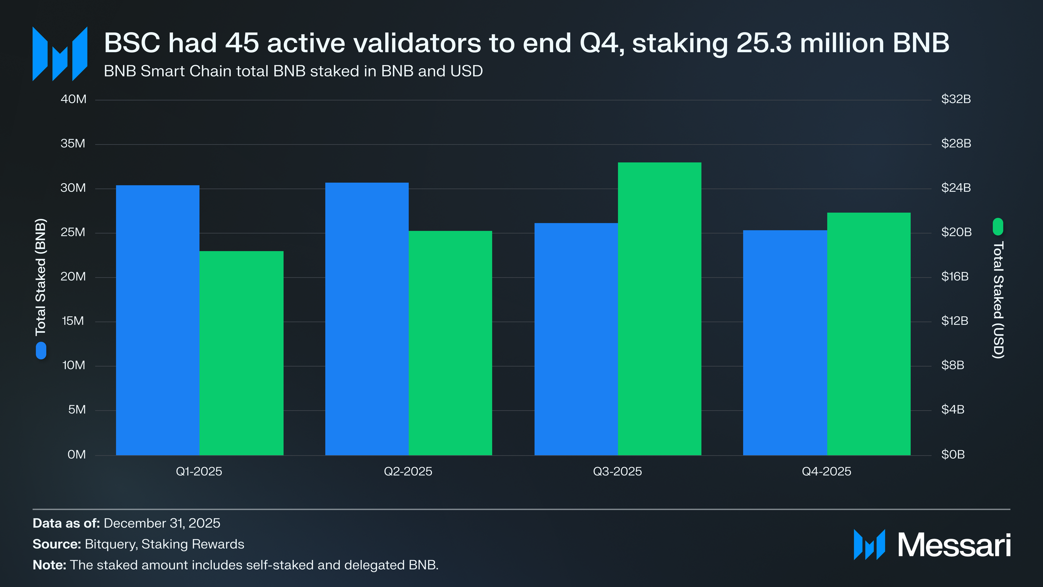 BNB 스마트 체인은 2025년 4분기 내내 45개의 활성 밸리데이터 전체 세트를 유지해, 2024년 4월 파인만(Feynman) 업그레이드가 밸리데이터 상한을 확대한 이후 이어진 중단 없는 기록을 연장했다.