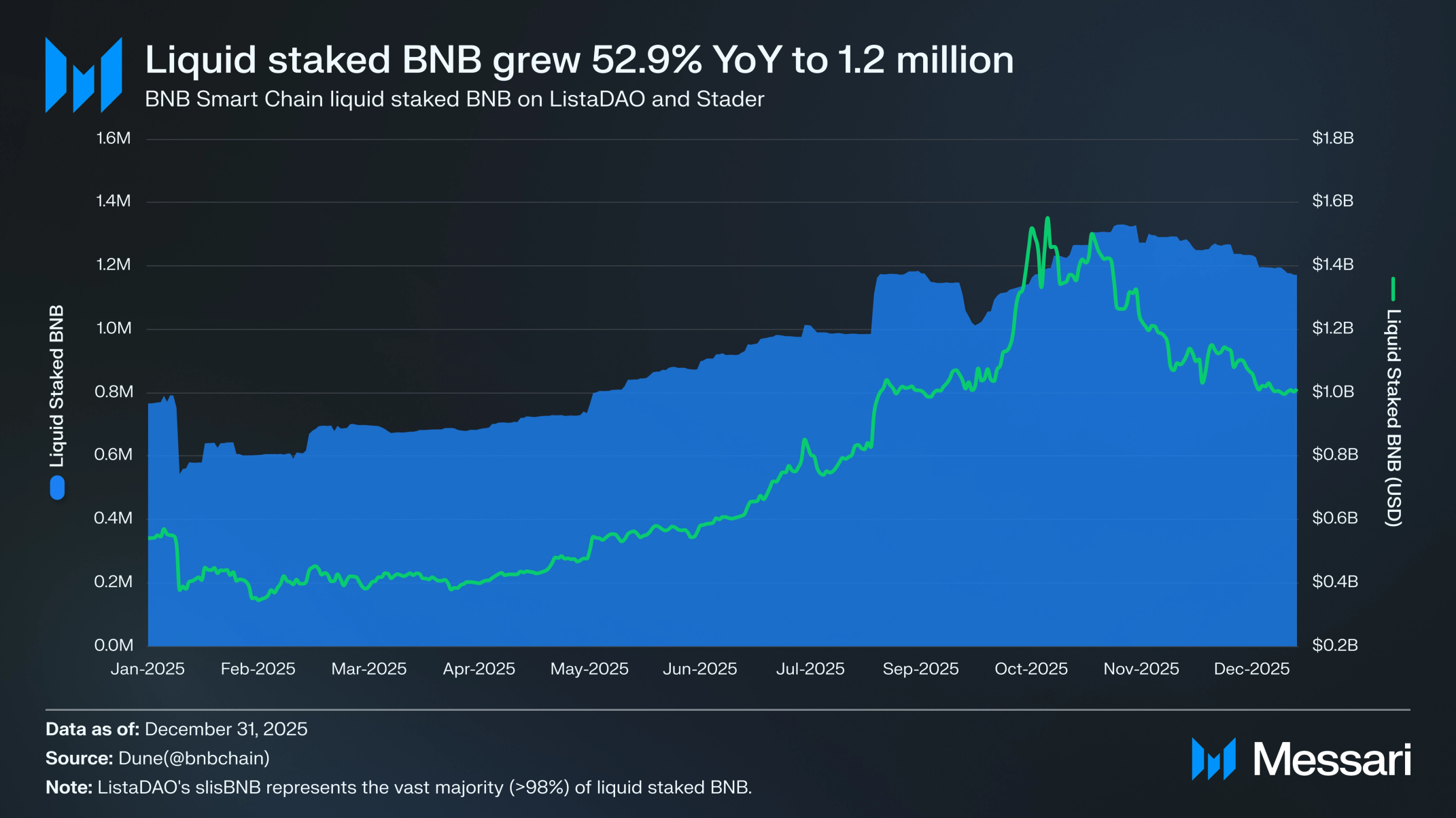 리스타 다오의 리퀴드 스테이킹 솔루션인 slisBNB는 BNB 체인의 지배적인 리퀴드 스테이킹 솔루션으로 부상했다. 4분기 말 기준 120만 BNB(10억 달러)가 리퀴드 스테이킹 솔루션에 예치되었다. 이는 3분기 말 110만 BNB 대비 리퀴드 스테이킹된 BNB가 전분기 대비 4.9%(전년 대비 52.9%) 증가한 수치다. USD 기준으로는 BNB 토큰 가격 하락을 반영해 리퀴드 스테이킹 가치가 전분기 대비 10.6%(전년 대비 87.2% 증가) 감소했다.