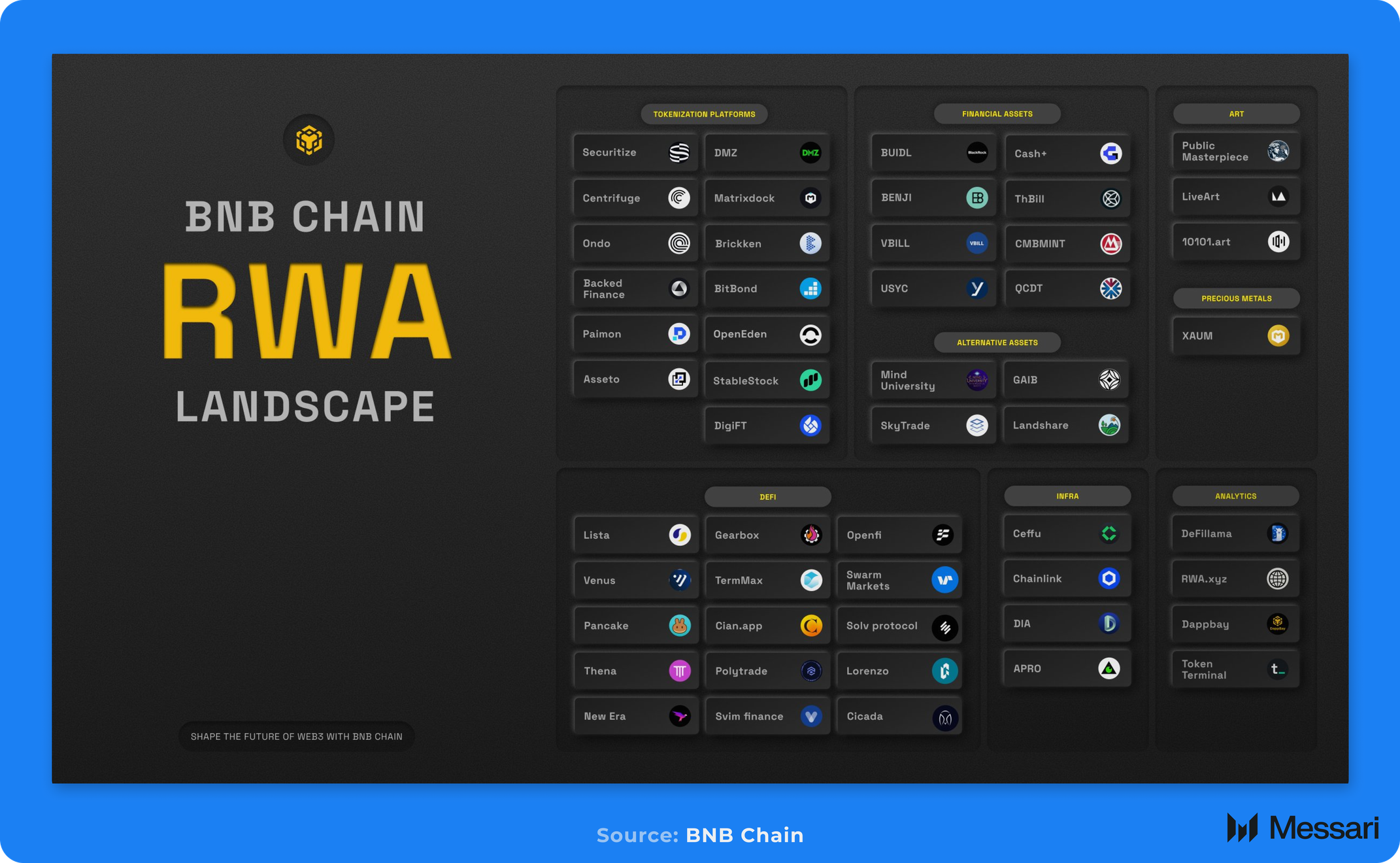 RWA는 2025년 4분기 BNB 체인의 핵심 전략 초점으로 유지되었으며, 기관 채택, 상품 다양성, DeFi 및 중앙화 인프라와의 통합에서 지속적인 진전이 이루어졌다. BNB 체인 RWA 분야의 주요 동향은 다음과 같다.