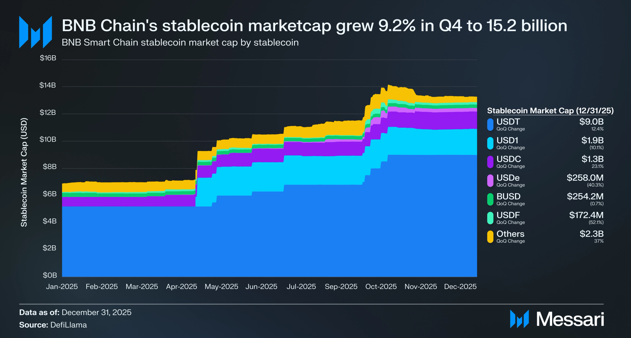 USDT는 BNB 체인의 지배적인 스테이블코인으로 남아, 90억 달러의 시가총액과 59.1%의 시장 점유율로 분기를 마감하며 전분기 대비 12.4% 증가했다. 이러한 증가는 DeFi, 중앙화 거래소 흐름, 결제 전반에 걸쳐 USDT가 주요 결제 및 유동성 자산으로 지속적으로 사용된 데 따른 것이다.