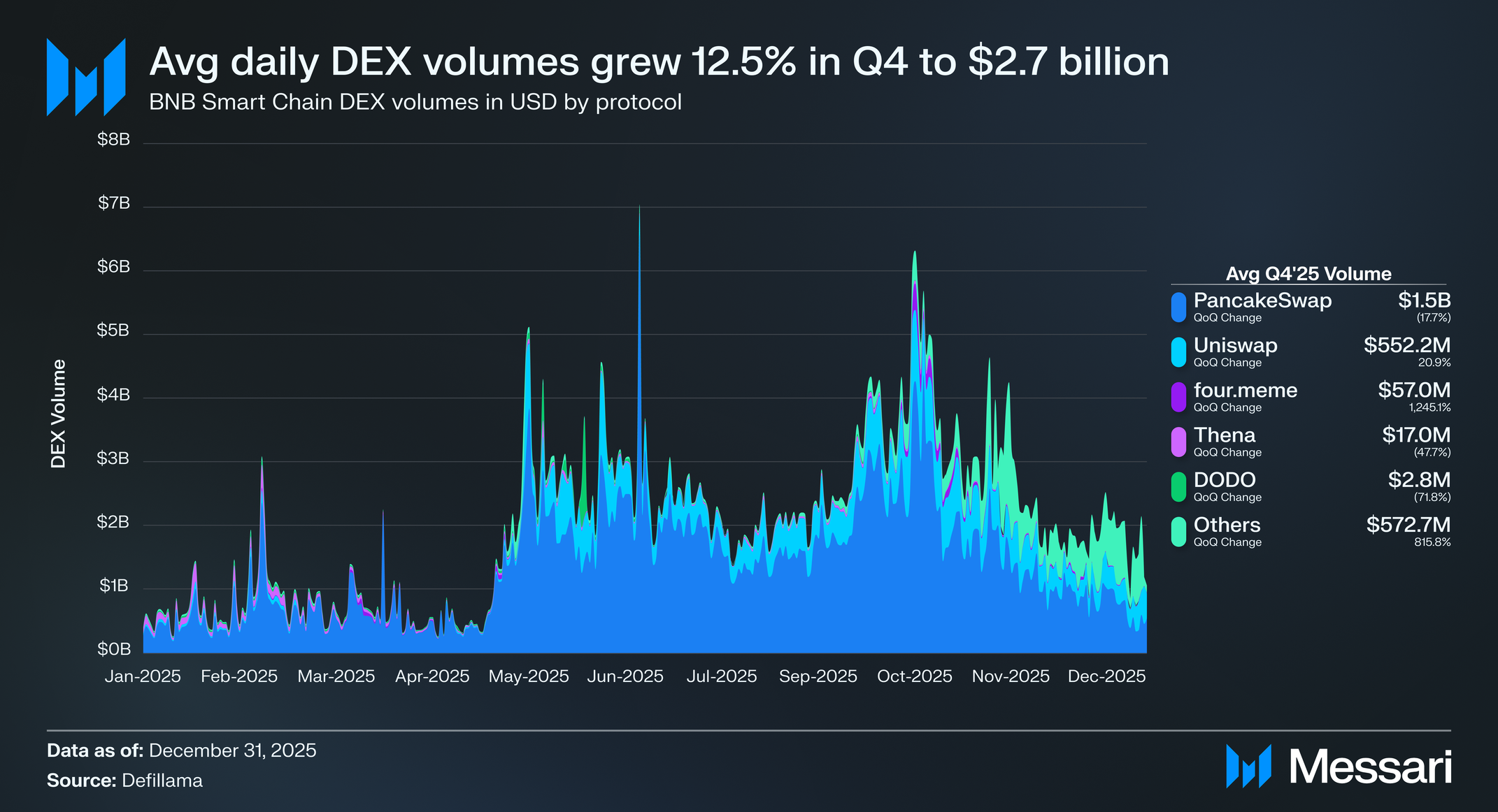 BNB 체인의 DEX 활동은 2025년 4분기 증가했으며, 평균 일일 거래량은 3분기 24억 달러에서 전분기 대비 12.5% 증가한 27억 달러를 기록했다. 이러한 성장으로 BNB 체인은 평균 일일 DEX 거래량 기준 전체 체인 중 2위에 올랐다.