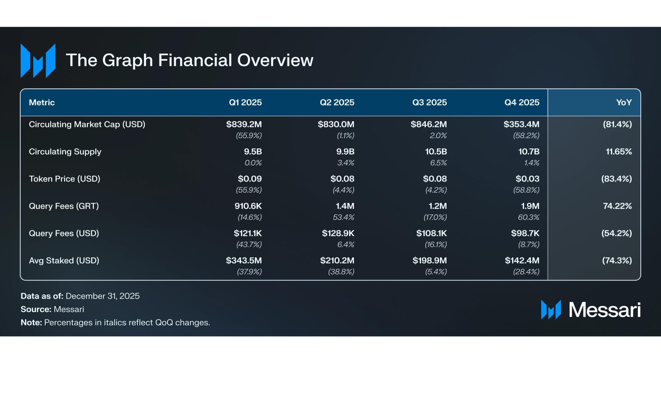 GRT는 분기를 약 0.03달러로 마감하며 전 분기 대비 58.8% 하락해, 30.8% 하락한 광범위한 암호화폐 시장 대비 부진한 성과를 기록했다. 가격 하락으로 유통 시가총액은 전 분기 대비 58.2% 감소해 Q3 8억 4,620만 달러에서 분기 말 3억 5,340만 달러로 떨어졌다.