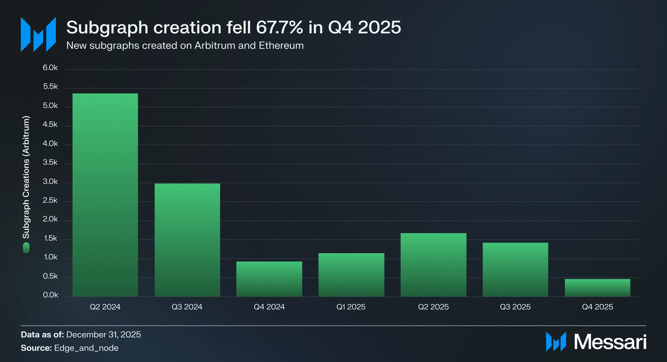 서브그래프 생성은 2025년 Q4에 크게 둔화되어, 개발자들이 분기 중 458개의 신규 서브그래프를 출시했으며 이는 Q3의 1,419개 대비 67.7% QoQ 감소한 수치다. 이는 2024년 Q4 이후 최저 분기 서브그래프 생성 수준이며, 2025년 초반에 관찰됐던 꾸준한 반등에서 눈에 띄는 반전이다.