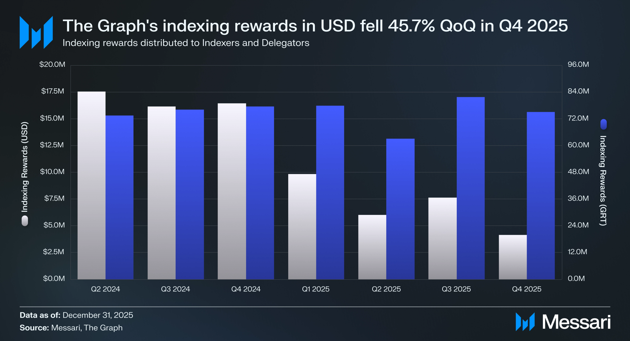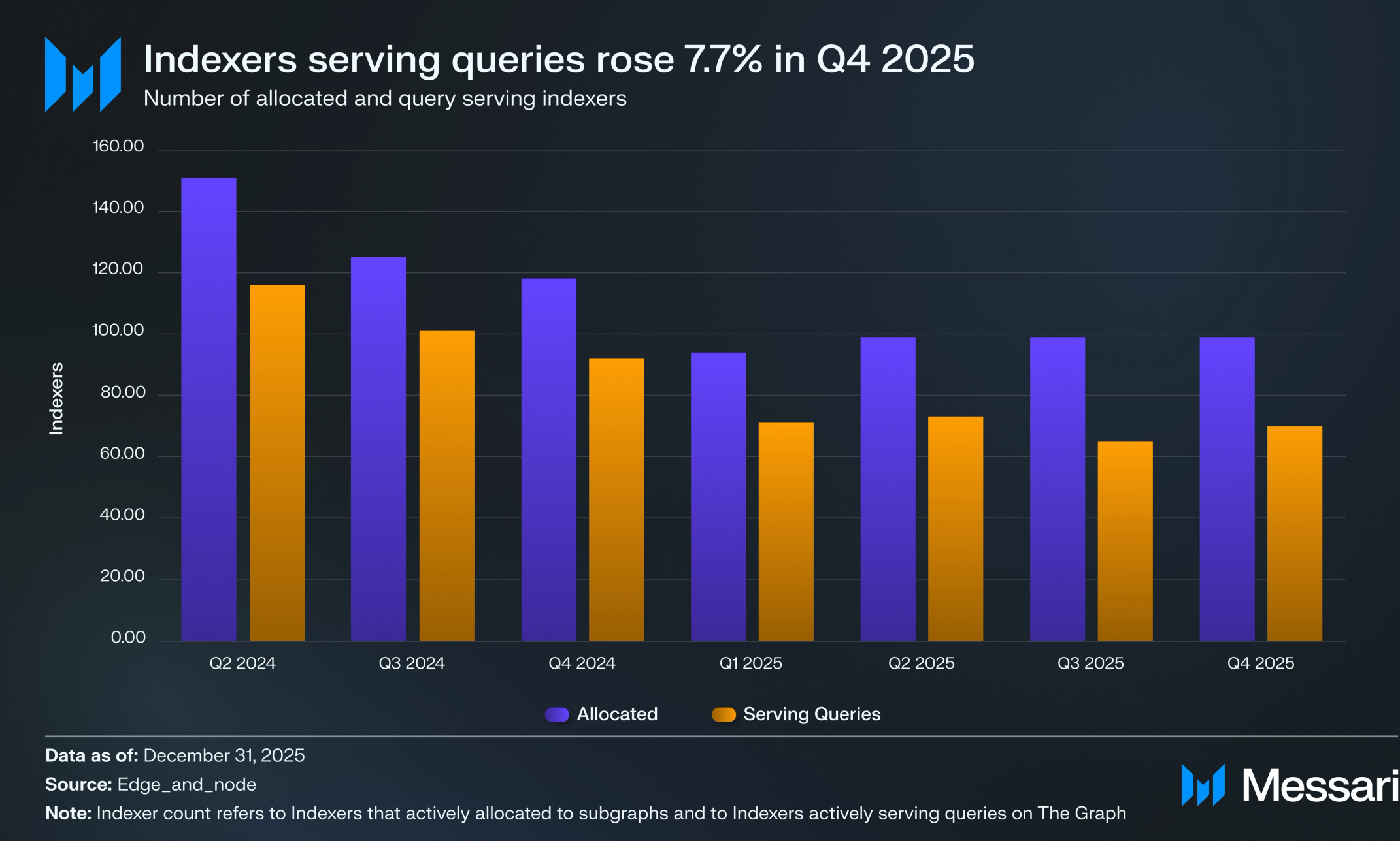 전체 보상이 줄었음에도 불구하고 쿼리를 처리하는 활성 인덱서 수는 Q4에 소폭 증가했으며, 이는 운영자들이 단기 수익성 저하에도 불구하고 대부분 헌신적인 태도를 유지했음을 시사한다. 그러나 수익 감소의 규모는 개별 인덱서들의 마진을 압박했을 가능성이 높으며, 인덱서 경제가 토큰 가격과 쿼리 수요 모두에 민감하다는 점을 재확인시켜 준다.