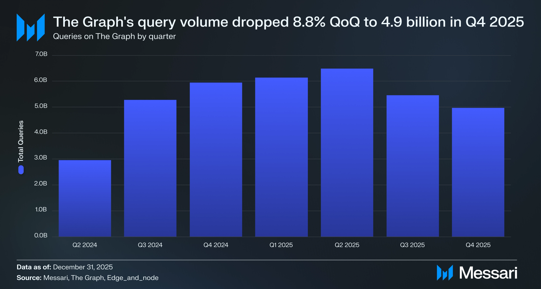 더 그래프의 쿼리 볼륨은 2025년 Q4에 Q3에 시작된 조정이 이어지며 다시 감소했다. 분기별 총 쿼리 수는 Q3의 54억 6,000만 건에서 8.9% 감소한 49억 7,000만 건을 기록했다. 이는 Q2에 기록된 역대 최고치 64억 9,000만 건 이후 두 번째 연속 분기 감소를 의미한다.
